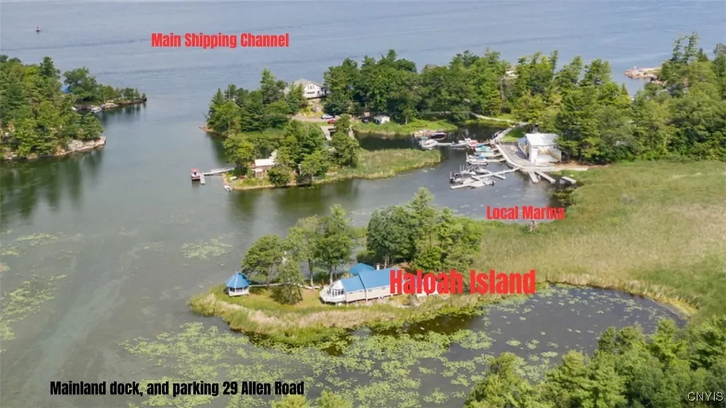 Get that "Peaceful-Easy feeling. Welcome to HALOAH ISLAND in the 1000 Islands! Located in a protected Bay , Haloah Island offers quick and easy access to both the Main Shipping Channel of the St. Lawrence River along with quick and easy access to the mainland. A second parcel located on the Mainland is included in the sale of Haloah Island and provides Dock and Parking for 2 vehicles. There is a nearby Marina that also provides seasonal dockage. The OPEN CONCEPT COTTAGE itself provides a "turn back time" experience with carvings on the fireplace mantel, unique copper kitchen island, 2 nice sized bedroom with upper loft for more sleeping or storage space, a rec room, and a glassed Gazebo for spectacular RIVER VIEWS in all directions! SOME AMENITIES of this WELL MAINTAINED PROPERTY INCLUDE... -UNHINDERED FREIGHTER AND CHANNEL VIEWS -NEW PRIVATE DOCK -LARGE SCREEN OUTDOOR GAZEBO -ADORABLE RUSTIC 2 BEDROOM COTTAGE WITH LOFT -UNIQUE ORIGINAL WOOD CARVINGS INSIDE AND OUT -COPPER TOPPED KITCHEN ISLAND -RECREATION ROOM/OFFICE -EASY ACCESS TO MAINLAND -YOU CAN ACCESS BY CANOE OR KAYAK IF DESIRED -RIVER-WILDLIFE GALORE -FISHERMANS and BOATERS' PARADISE and all the 1000 Islands has to offer! Only 15 min to Alexandria Bay where you will find Boldt Castle, Restaurants, Shops and more..Most furnishings will stay. Your Dream of Island Living in the 1000 Islands can become your reality!