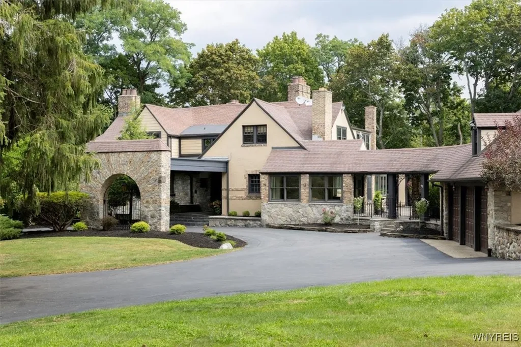 Brookledge – A Timeless Country Manor. Every so often, a property comes along that makes you pause. Brookledge is that rare find—an extraordinary Country Manor built in 1923, rich with history, elegance, and craftsmanship nearly impossible to replicate today. Picture century-old trees echoing with memories: sunlit summer days, fireflies dancing in twilight, poolside laughter, joyful celebrations, and holidays that turn into lifelong stories. For decades, Brookledge has been the backdrop to moments that matter—and now, it's ready for its next chapter. Tucked at the edge of East Aurora’s historic village, Brookledge offers privacy with ideal access. Just minutes from Route 400, you’re conveniently connected to Buffalo, the airport, ski resorts, and Niagara Falls. East Aurora itself is more than a location—it’s a lifestyle. This beloved village blends small-town charm with cultural richness, from boutiques and cafés to galleries, breweries, chocolate shops, and historic landmarks like Knox Farm and the Millard Fillmore House. A hub of the Arts & Crafts movement, it offers a vibrant blend of heritage and modern living. As you arrive at Brookledge, a 7,800-square-foot manor reveals itself across nearly nine acres of manicured grounds, towering evergreens, stone patios, and the serene whisper of Tannery Brook. Inside, the home features hand-carved black walnut woodwork, six fireplaces, stained and antique German glass, marble floors, arched doorways, and detailed craftsmanship throughout. The grand living room stuns with oak beams, a carved fireplace, and a marble floored sunroom with panoramic brook views. A refined dining room glows with leaded glass and a marble fireplace. The kitchen is both functional and elegant, with granite countertops, Sub-Zero appliances, a center island, pantry, and sunny breakfast nook. The primary suite is a true retreat with a double-sided fireplace, sitting room, spa-like bath, and Juliet balcony. A cozy library, family rooms, billiard room, kitchenette, and walkout lower level offer room to live, gather, and grow. A separate three-bedroom guest house, in-ground pool, and sport court complete this remarkable estate.