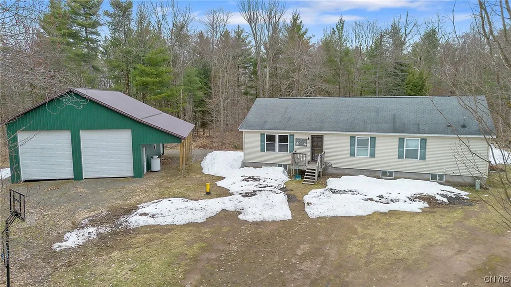 Nestled on just under 27 acres of picturesque land, this beautifully updated ranch offers the perfect blend of modern comfort and outdoor adventure. With nearly 1,500 sq. ft. of thoughtfully designed living space, this home has been meticulously maintained and upgraded. Step inside to find a refreshed kitchen featuring brand-new countertops, a spacious island, and updated appliances—perfect for entertaining. Additional updates include new toilets, a new furnace, a whole-house water filtration system, and a tankless hot water heater for energy efficiency. A walk-up attic provides the potential for additional living space, while the 9-foot ceilings in the basement and a convenient Bilco door add functionality and storage options. Outdoor enthusiasts will love the direct access to the C4 trail, ideal for snowmobiling in the winter and four-wheeling in the warmer months. The newly built 40’ x 50’ pole barn with a 10-foot overhang and two 12’ x 12’ garage doors provides ample space for equipment, vehicles, or a workshop. Located just minutes from Oneida Lake, this home offers the perfect balance of peaceful country living with easy access to fishing, boating, and all outdoor activities. Don't miss out, schedule your showing today!