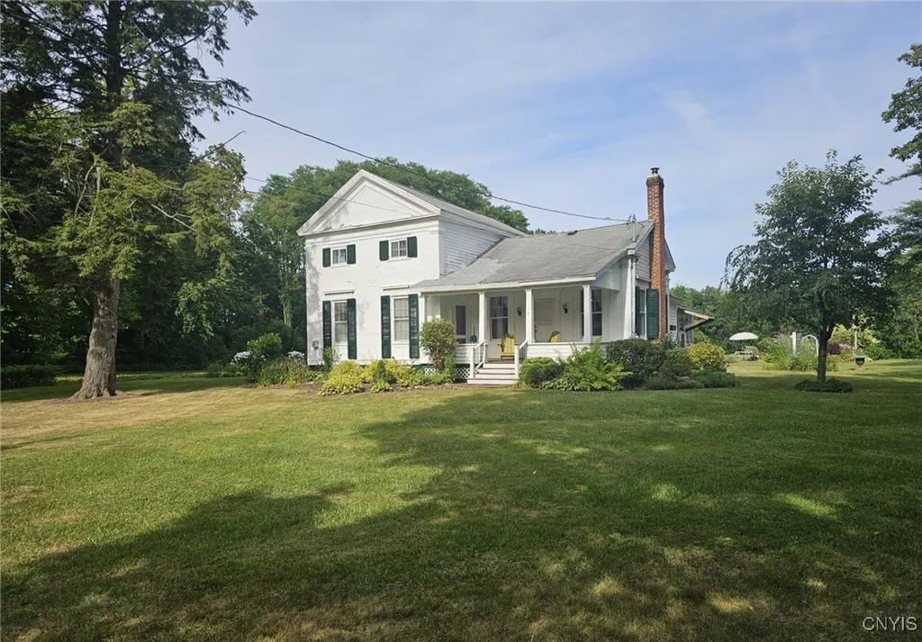 Experience the charm of history with this well maintained 1840 Farmhouse, featuring high ceilings and windows, intricate molding, expansive rooms, and distinctive character. Situated on 23.50 acres, it boasts stunning perennial gardens for enduring enjoyment, as well as open fields and woods for recreational activities. With over 2,370 sq. ft of living space, this 5-bedroom, 1-bath residence perfectly combines historic allure with modern conveniences. Upon entering through the back of the house, you will find a large, fully renovated mud/laundry room and sunroom, which leads you into a country-style eat-in kitchen complete with 2 separate sink areas, and a walk-in pantry. The open-concept dining and living areas are painted in farmhouse hues, creating a cohesive atmosphere. Centrally located in these rooms is a pellet stove. Additionally, a welcoming side porch provides another entry point with generous space. The primary bedroom, located on the first floor, is massive, and offers direct access to the front porch. The hardwood floors throughout the house are gleaming. This restored home features numerous highlights and has much to offer, making it essential to see to fully appreciate. Do not miss the opportunity to own this country farmstead that is gracefully situated on 23.5 BEAUTIFUL ACRES!