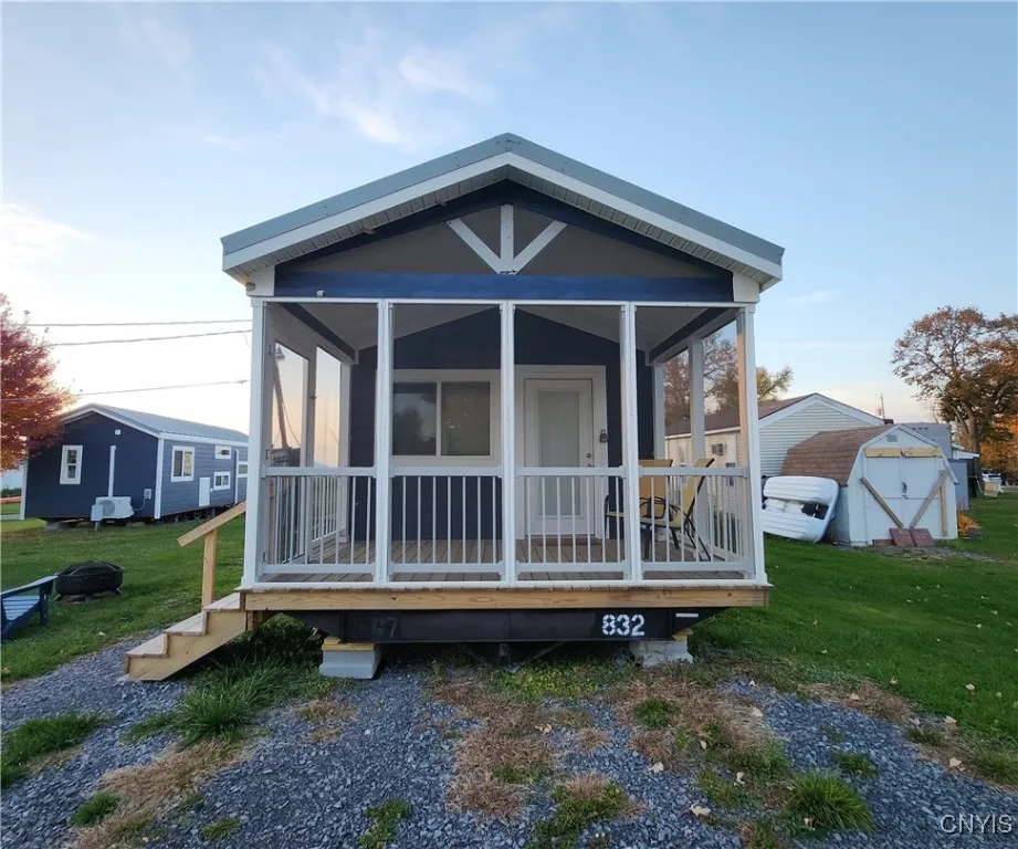 Discover this brand-new, turnkey mobile lakeside retreat, perfectly situated on the picturesque shores of Henderson Bay, Lake Ontario. This fully furnished 2-bedroom, 1-bathroom mobile cottage is ready for you to enjoy. It features an open-concept living and kitchen area with granite countertops, stainless steel appliances, and sleek white cabinetry. The home is climate-controlled with modern mini-split units offering both air conditioning and heating. Relax and take in stunning sunsets from the screened front porch, steps away from the Lake. The property includes access to private docks, a clubhouse, and on-site laundry facilities. As an added bonus, the cottage comes with the full 2025 season—valued at $3,250—which covers public water, septic, and trash services. Nestled in a peaceful, well-maintained RV resort community, this property is the perfect choice for a serene lakeside escape, whether for seasonal living or a vacation retreat. The resort also offers a rental pool option, allowing you to earn passive income when you’re not using your cottage. Call today!
