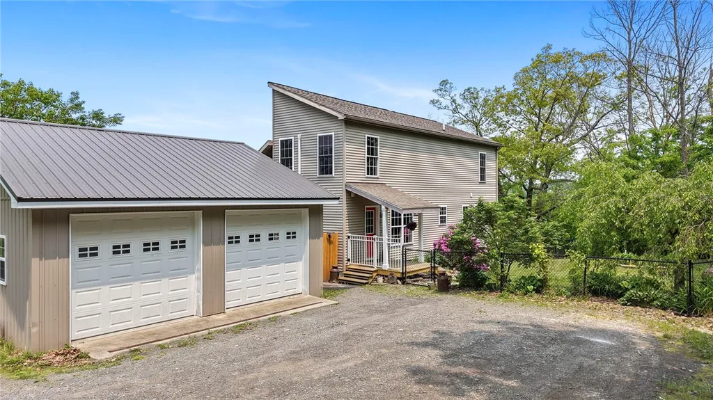 Welcome to your dream countryside escape. Nestled in the scenic hamlet of Brooktondale, this beautifully maintained 3-bedroom, 2.5-bath home sits on nearly 5 picturesque acres offering peace, privacy, and a lifestyle rooted in nature. The main level features an open-concept layout with vaulted ceilings, hardwood floors, and a wall of windows that fill the space with natural light. Sliding doors lead to a west-facing deck with an awning—perfect for watching sunsets over the valley. The inviting living area includes a cozy pellet stove, and the bright, cheerful kitchen offers counter seating, plenty of cabinetry, and a formal dining area. A spacious primary suite with a walk-in closet and ensuite bath completes the main floor, making one-level living easy and elegant. Upstairs, find two more bedrooms with large closets and a full bath. The bonus room with gas fireplace makes a perfect office, game room, or second living space. Horse lovers and outdoor enthusiasts will love the barn with 3 stalls, 70x90+ ft sand arena (level and well-drained), and open trails for riding. Gardeners will appreciate the fenced front yard with perennial beds, the flat backyard with a large vegetable garden, and the oversized detached garage with room for two cars and extra storage. Located just minutes from Cornell University, Ithaca College, and downtown Ithaca, this rare property blends comfort, charm, and versatility. Whether you're seeking space to expand, a retreat from city life, or room to ride and grow, this home checks every box. Open house Sunday from 12:30–2:00.