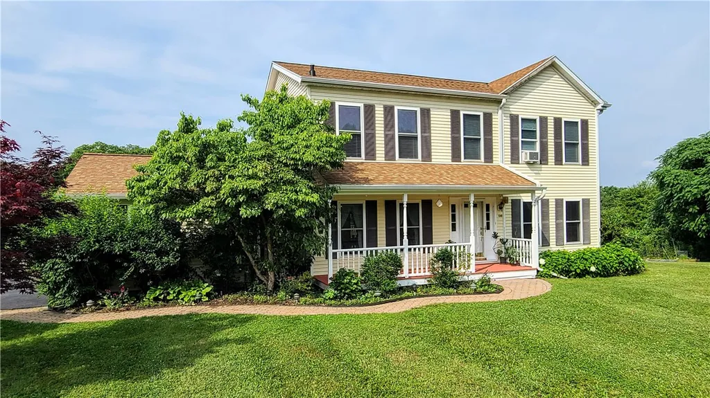 Nicely sited South Hill two-story home blending a farmhouse-style front with a sprawling rear deck that overlooks 2.16 scenic acres. This spacious residence offers 3 full levels of finished living area, ideal for a variety of household needs and lifestyles. A classic ceramic-tiled entry foyer is flanked by a formal dining room with hardwood floors on one side and a charming living room on the other. Anchoring the living room is a gas fireplace surrounded by richly stained natural wood built-in bookcases, ready to showcase books, art, and personal mementos. The large eat-in kitchen, brightened by the home’s southwest orientation, welcomes afternoon light and vibrant sunsets. It features stylish granite countertops, a center island for additional prep space, stainless steel appliances, oak cabinetry, and a full-sized pantry. Just off the kitchen is a casual breakfast room for informal dining and a generously sized family room, ideal for entertaining or gatherings. The lower walk-out level adds even more flexibility with a second expansive family room, a convenient office nook, and direct rear yard access. This finished level includes tongue-and-groove ceilings, recessed lighting, built-ins, full windows, and storage space. Upstairs are 3 bedrooms, including an oversized primary suite complete with an expansive walk-in closet, an additional closet, and a private bath featuring a dual-bowl granite vanity. The main bathroom also offers a granite dual bowl vanity, and a second-floor laundry closet adds convenience. Outdoor living is equally impressive with a welcoming covered front porch, a rambling multi-tiered rear deck, a quaint stone patio, and beautifully landscaped beds. A fully fenced garden area is perfect for vegetables, complemented by a storage shed, lush lawn, charming stone walls and walkway, and a stunning pergola draped in wisteria and trumpet vines, creating a truly magical outdoor retreat. Two car garage plus a 2100W ground-mounted, grid-tied solar panel array to offset electric costs. Set within a quiet loop-style country neighborhood of well-maintained homes on large lots just four miles from Ithaca.