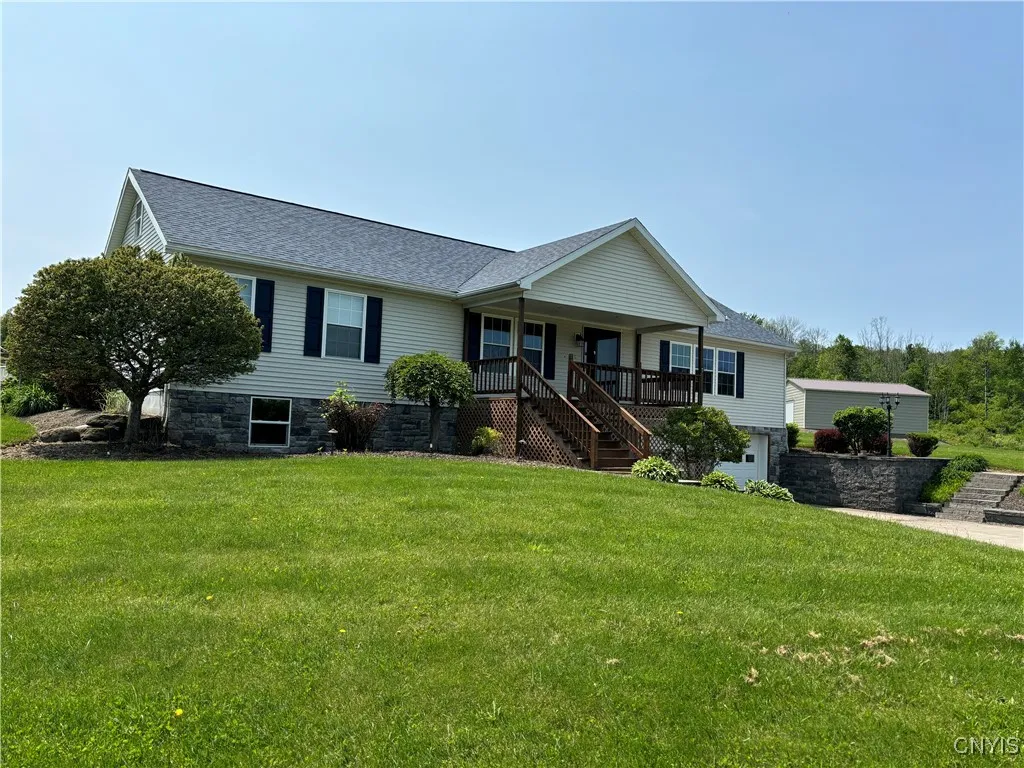 Look no further! This is the property you will want to make your own. 1,792 sq. ft. on the main level of this 3 BR, 2.5 bath, ranch style home and you're going to love every inch. From the lovely exterior with vinyl siding and cultured stone and full front covered porch to the 10 fabulous acres with amazing countryside views you can see from every window. The front entryway leads you to the large living room with propane fireplace and shelving featuring large front windows that let the natural sunlight in. Eat at the island with breakfast bar or at the dining room table adjacent to the sliding glass doors that take you out on the back, covered patio with decorative Pavers. Back inside you'll enjoy spending time in the kitchen with stainless steel appliances and double sinks with a window looking out over the private 10 acres. The primary suite is spacious with walk-in closet, full bath including a shower, two sinks, and two closets. The other two bedrooms are located right next to the second full bath with tub. Take the stairs to even more room in the full, insulated attic with potential for recreation or finish it for more additional living space. In floor radiant heat and central air will keep you comfortable year round. The utility room is off the two car garage with electric door openers. Entertain in the full lower level with a half bath, built in bar with refrigerator and a wall lined with shelves. After that, head out to the back patio with hot tub and views including a fire pit, above ground swimming pool with deck and make the five year old 30x30 outbuilding a place to spend some quiet time or to store any equipment you may have. The asphalt shingles roof is new installed in 2025. 3 minute drive to I-81 and the Village of Marathon, 5 minutes to beautiful Maple Hill Golf Club, 10 minutes to Greek Peak and Hope Lake Lodge and neutrally located between Ithaca, Binghamton and Syracuse. There is neighboring additional 7.60 acre parcel available tax map #149.00-01-01.112 Call for details.