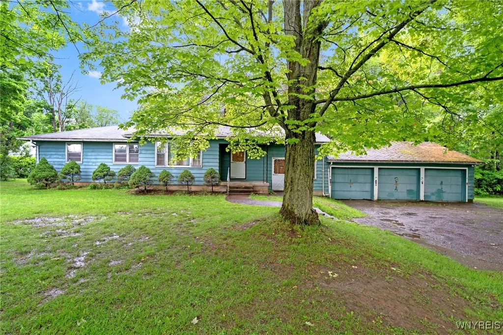 13253 Quaker Rd; Original owner is selling this solid 3 bedroom 3 car garage ranch home that is nestled on 2.5 acres surrounded by mature trees and backs to the Gowanda country club golf course. The front door offers a private entry with hall closet and leads you to the generous sized living room with fireplace and hard wood floors. Good sized eat in kitchen with ample cabinet and counter space. 3 bedrooms will also find hardwood floors and good sized closets. The breeze way connecting the home to the garage is a great sized space for additional living space or storage. The full dry basement with poured concrete walls extends the entire length of the home, with great potential uses. Out back a private trail leads you to the 2 story 3 car garage-barn that overlooks the Koi stocked pond, adding to the peaceful, serene setting. Negotiations begin June 3rd.
