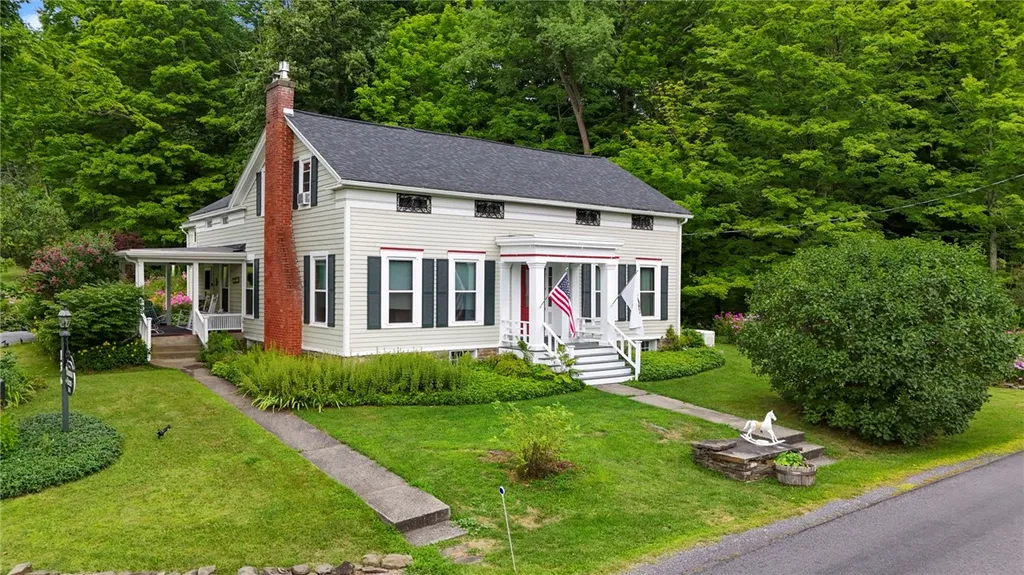 Welcome to 136 Thomas Road, a beautifully maintained historic property just 10 minutes from Cornell, offering the perfect blend of historic charm and modern convenience. This versatile home features energy-efficient solar panels that cover nearly all electrical costs, a valuable benefit for a home of this size. The main level boasts a spacious primary suite, perfect for one-floor living, while the flexible layout makes it ideal as a private residence, multi-generational home, or potential income-generating retreat. Set on 26 acres of serene countryside with trails leading to wetlands, woods, a tranquil pond, and a picturesque brook complete with a charming walking bridge, this property is a nature lover’s paradise, perfect for birdwatching and enjoying the abundant wildlife. The original barn is structurally sound, offering two levels of space for parking, equipment, or even small farm animals, adding to the property's versatility. There’s also a separate 2.77-acre building lot for those interested in expanding or building anew. The current owners have operated the property as a successful B&B, with private owner’s quarters and five beautifully appointed guest rooms, each with its own unique character. While this business opportunity remains available, the home’s layout and amenities make it equally well-suited for those seeking a personal sanctuary in a peaceful country setting. Business, furniture, and equipment can be purchased separately. Schedule your private tour today to experience the unique charm and potential of Thomas Farm.