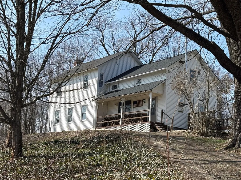 COUNTRY LIVING! Spacious colonial set on 4 acres at the end of a quiet, dead-end road. This 3-bedroom, 2-bath home offers a blend of open lawn and wooded areas, over a 6 ft pond stocked with goldfish and catfish, and plenty of room to roam. Enter into the tiled floor entrance with wood burning stove and a large mudroom with plenty of storage to the side. The kitchen features stainless steel appliances with tiled counters and backsplash, while the dining room boasts wood floors, beautiful built-ins, and a second staircase leading upstairs. The living room showcases hardwood floors, a working fireplace, and a pellet stove. The first floor also includes a full tile bathroom, separate laundry room with utility sink and storage. Upstairs, you'll find three bedrooms and a full bathroom. The spacious primary bedroom featuring a jetted tub, large walk in closet a separate stairwell leading to the downstairs and built in window A/C. There's also attic scuttle access and additional storage space. Outdoor living is just as impressive, with a deck overlooking the side yard and firepit, a large chicken coop that can accommodate up to 24+ chickens with attached run, large garden and playhouse. There are 2 additional sheds for storage and a firewood shed by the 2 car garage including dog kennels and workbenches. Follow the path down to the pond with dock and relax by the water or take dip to cool off. There is a shooting range already in place. Whether you're looking to garden, relax by the pond, or entertain on the deck, this property offers space, charm, and versatility in a peaceful setting.