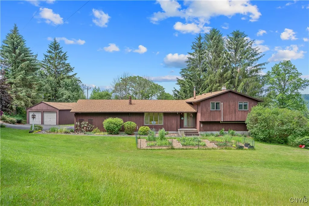 SPRAWLING SPLIT-LEVEL HOMESTEAD IN THE ROLLING HILLS OF TULLY WITH UPDATES IN ALL THE RIGHT PLACES! Situated on just under 3 acres, this 3 bed/3 bath (with potential 4th bedroom!) home boasts structural superiority with NEW roof, gutters, attic ventilation, insulation, & room to roam! The extra wide, turnaround driveway draws you in with the delight of wildflowers & gardens as you pull up. Enter through the 2-car attached garage, or frolic along the paver pathway up to the front door alongside the bright gardens. Coming through the front door, you're greeted by a quaint foyer that opens into a spacious open-concept living room/dining room combo, featuring gleaming NEW hardwood flooring, vaulted ceilings, & mid-century modern charm. Just off the dining room, head into the eat-in kitchen for quality hardwood shaker cabinets to satisfy all your kitchen storage needs, plus ample counter space & NEW induction stove/double oven combo with matching range, NEW dishwasher & breakfast bar. Just up the steps off the living room, find the perfectly situated full bath for the bedroom level of the home, primary bedroom with en suite bath, & NEW mini splits in each room to keep you cool in the hot summer nights. Traveling down to the lower level, find a large family room with wood burning fireplace, a separate office/den (or potential 4th bedroom!) with built-in library & storage, plus full bath & laundry room, making a perfect place for a guest or teen suite. On to the lowest level, find a large dry basement with exterior walkout access to the garage & workshop space! Don't miss out on the sprawling grounds, with 2-level deck off the dining room to enjoy the scenic & secluded feel of this lot, NEW fire pit, well-established gardens surrounding the property, & additional detached 2-car garage. Other updates include NEW radon mitigation system, water softener system, hot water heater, smart thermostat & GFCI outlets. Located a convenient 20-min commute into Syracuse, don’t miss your chance to own this Tully treasure!