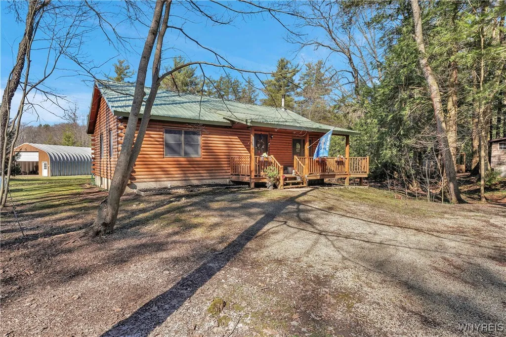 Charming 2-bedroom ranch style log home on over 6 acres, situated on the edge of the Java Lake Colony! This home features a spacious open kitchen and living area with vaulted tongue-and-groove ceilings, a breakfast bar, and a wood stove—perfect for those WNY winters. French doors off the kitchen lead to a large deck, which connects to a partial wraparound deck and a covered front porch—great for enjoying the outdoors. Built in 1997, it offers the warmth of log construction with the benefits of more modern design. The home also features a steel roof and central A/C for added comfort and convenience. Bring your toys! The 30’x44’ Quonset steel building, equipped with a wood-burning furnace, is perfect for storing AT Vs, snowmobiles, or working on projects year-round. Plus, with access to Java Lake, the beach, and community facilities, you can launch your kayak and enjoy the water just minutes from home. Located on the edge of the colony, this property offers more space and privacy while still benefiting from lake access. A great opportunity with so many possibilities—don’t miss out!