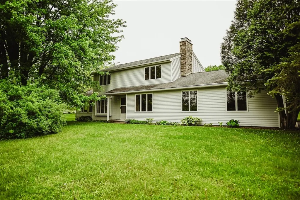 Nestled on a stunning corner lot within a tranquil cul-de-sac, this beautiful colonial home is enveloped by picturesque mature landscaping, vibrant flowers, grape vines, and fruit trees, offering both beauty and privacy. This exquisite residence features a 15 x 27 great room complete with a cathedral ceiling and an abundance of windows that flood the space with natural light. The interior is enhanced with fresh paint and new recessed lighting, evoking a modern and welcoming atmosphere The heart of the home, the kitchen, shines with new cherry cabinets, elegant Cambria quartz countertops, and stainless steel appliances, creating a perfect blend of style and functionality. The home is wrapped in low-maintenance vinyl siding. Comfort year-round with central air, a newer furnace, and a new water heater. The first floor presents a spacious eat-in kitchen with sliding doors that open to the outdoors, a convenient first-floor laundry room, and a half bath. It also features a formal dining room and a family room with a charming brick fireplace, perfect for gatherings or cozy nights in. Each room has been freshly painted, highlighting the home's meticulous upkeep. Upstairs, the home offers three generously sized bedrooms. The primary suite is a true retreat with a newly updated full bath and a walk-in closet. Throughout the second floor, plush carpeting throughout adds a touch of luxury and comfort. Additional features include a full basement and a two-car attached garage with a concrete floor refinished with epoxy, providing ample storage space and convenience. This gorgeous colonial home is a blend of elegance and functionality, nestled in a serene, beautiful setting. Please see attached addendum for all the updates. --