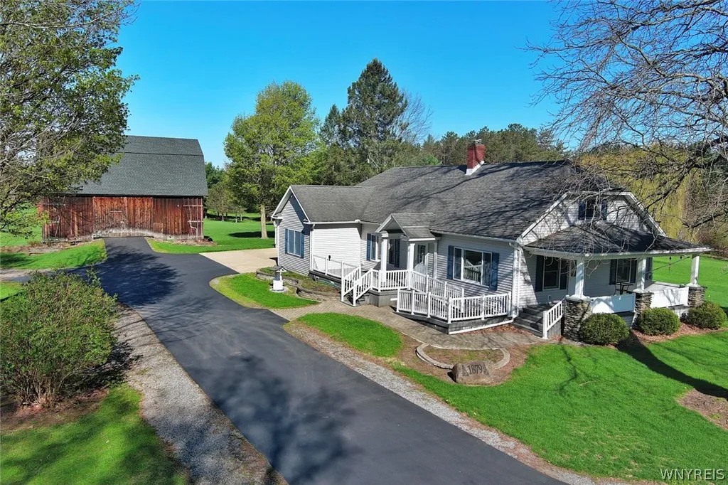 Welcome to a truly special property where charm, history & endless possibility come together. Once an evergreen tree farm, this lovingly maintained homestead offers a rare opportunity to enjoy peaceful country living just minutes from the charming Village of East Aurora, with its shops, restaurants & parks. Thoughtfully & extensively renovated in 2002 w/ accessibility in mind, the home features a spacious first-floor primary suite w/ a walk-in shower & jetted tub, convenient first-floor laundry, a pantry & an attached 2.5-car garage designed for comfort and ease of living. The expansive living room opens to both the front porch & side deck with ramp access, while a beautiful stone gas fireplace serves as a stunning focal point, accented by a custom mirror painted w/ gold evergreen trees commissioned by the owners. Two additional bedrooms are located near the second full bath, complete w/ dual sinks & a skylight. Upstairs, the unfinished second level w/ an existing staircase offers incredible potential to create additional living space tailored to your needs & vision. Practical updates & low-maintenance features include vinyl siding, replacement windows, central air conditioning & the peace of mind of a backup generator. Step outside & take in the beauty of the 15.5+/- acres of level, partially wooded, meticulously maintained land. A remarkable 30' x 40' two-story wood barn w/ loft provides endless possibilities for horses, hobbies, workshop space, storage or future expansion. AN ADDITIONAL 4 ACRE BUILDING LOT IS ALSO AVAILABLE (see MLS# B1677468) Updates Include:• 2024 Furnace • 2015 Central Air • 2024 Rebuilt Side Porch & Ramp • 2017 Barn Roof • 2006 Front Porch • 2002 House Roof. OPEN HOUSE: Sunday, May 3, 1:00–3:00 PM. OFFERS WILL BE CONSIDERED STARTING Friday, May 8 at 12:00 PM (no escalation clauses, please). Survey to be completed prior to closing. Acreage is approximate & will be finalized. Property is being subdivided; taxes & assessment TBD. Whether you envision a hobby farm, private retreat, or a place to grow & create lasting memories, this one-of-a-kind property is ready to welcome you home. ++Images featuring furniture have been virtually staged ++
