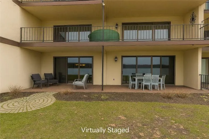 Enjoy easy living with spectacular water views from this warm and inviting home. The open living and dining area features beautiful flooring, exposed beams, and a welcoming layout perfect for everyday living or entertaining. A spacious custom kitchen area with wood finishes, seating, and pendant lighting creates a unique gathering space that flows effortlessly into the dining area. Large sliding glass doors bring in natural light and lead to a covered patio overlooking the water, providing the perfect spot to relax with morning coffee or unwind in the evening while taking in the peaceful scenery. The patio offers comfortable outdoor living space with sweeping views of the lawn, docks, and waterfront beyond. Inside, the home blends character and comfort with charming details, warm wood accents, and flexible space for hosting family and friends. Whether enjoying the cozy interior gathering spaces or the beautiful outdoor setting, this property offers a rare opportunity to enjoy waterfront living and stunning views year-round.