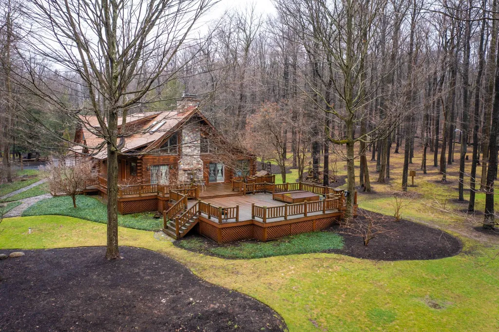 We are is pleased to present a special retreat to luxury and serenity in this 4,933 square foot one-of-a-kind custom built log home estate. Rarely do you find a property of this caliber with the additional desirable attribute of a prime location. Secluded privately in the hills near the popular Peek N Peak ski, golf and water sports resort, this property is the ultimate vacation destination or a forever home hide-a-way. 64.9 acres surrounds you with hardwoods, a 3.9 acre park-like yard, a stocked pond, and a home where wildlife abounds. Just minutes to Findley & Chautauqua Lake, the Chautauqua Institution and WNY wine country, outdoor enthusiasts will have additional recreational opportunities to enjoy in the near neighborhood of many Western New York relaxing destinations. This three level home boasts four bedrooms and three and a half bathrooms, comprising of a 2136 sqft main level, a 900 sqft upper level, and a bonus of 1897 sqft. of a finished lower-level basement for additional living space. A six car garage is attached for parking convenience and storage. If home entertainment and barbecue afternoons are in your plans, a 2,200 sq.ft. multi-level deck is part of this home and large enough for the biggest family or social gatherings under the shady trees. The deck also features a built-in hot tub. The pond is stocked with bass and other species of fish with a dock and shore side pavilion. Proximate to the custom-built home is a two story 7,000 sqft heated barn for more vehicles, more storage, recreational vehicles, and could easily be expanded for more living space for a second guest home in the popular barndominium style construction. The property has two custom built tree stands for deer hunters, and they present more like a mini tree house than a hunting blind having electricity, heaters and an alarm system. All comfort and style in these elevated perches for the fall. With so much to see and experience, the attention to quality, detail and finishing is remarkable and clearly is the ultimate destination in country, vacation and outdoor living. FEATURES: Construction: White Cedar Logs, Architectural shingles, Kitchen: Hickory cabinets, Maple floors W walnut caps, Porcelain sink, Sub zero fridge, Jenn-air Range Great Room: Custom 2-story stone fireplace, Vaulted Ceiling, walk out to deck Bathrooms: (Upper) Steam Showers, Jacuzzi Tub in primary bathroom Bunk Room: Sleeps 6-10, Vaulted Ceiling with Bathroom Lighting: Recessed Ceilings: Tongue and groove pine Windows: Andersen Laundry: Main floor Security: 62 Zone - Whole house Humidifier: Whole house Entrance: Gated Driveway: Paved Water: Well x 2 Septic: Septic Fuel: LP Gas Heat: Forced air & Pellet Stove A/C: Central Wifi: Armstrong Barn/Shop: Heated, Bathroom, Electric, two story. DIMENSIONS: Kitchen/Dining: 21.3 x 17.9' Great Room: 28.6' x 17.2' x 22' vaulted Side Room: 13.8' x 11.2' Loft: 18.3' x 11.3' Bathroom lower: 6.8' x 7.9' Laundry: 11.8' x 6.8' Foyer: 15.8' x 8'6' Primary Bedroom: 14.8' x 14.7' with balcony Primary Bathroom: 13' x 10.8' Bedroom 2: 13.6' x 11.9' with balcony Bedroom 3: 11.7' x 15.2' Bunkroom: 28.4' x 24.6' x 12.4' vaulted Bunk Bathroom: 11.6' x 5.7' Bathroom upper: 9/ x 5.8' Lower level: 36.5'x 26.6' Lower level Side room: 13' x 17' Rec room: 20.4' x 18.9'
