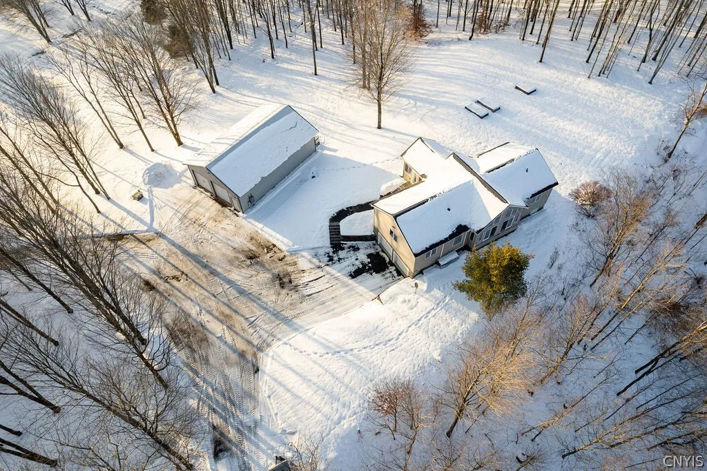 Incredible opportunity to own a beautiful and secluded ranch home situated on its own serene and peaceful 9.24 acre setting with large heated 30'x48' pole barn, including 10,000lb car lift! Gorgeous granite counter kitchen, with breakfast bar and pantry closet, sits wide open to living room with cathedral ceiling and wall of windows overlooking the magnificent scenic view of nature. Kitchen offers a plethora of cabinet and counter space, plus stainless steel appliances. Main floor layout extremely conducive to in-law quarters, with two en suites, one at each wing of the home. Primary bedroom features walk-in closet and a gorgeously renovated bathroom with impressive tiled walk-in shower with window to enjoy the beautiful natural and private setting. Main floor also features dedicated 1st floor laundry room, saving your back countless trips up and down basement stairs with laundry. Mini splits on main level of home provide the comfort and convenience of separate zones for heating and cooling. Luxury of heated 2 car attached garage keeps you from having to brush snow off your cars in the winter mornings. Finished basement with heated floor yields outstanding space for use as a rec room, or could be converted quite easily to additional bedrooms - the in-floor heat makes for an exceedingly comfortable environment in the basement. Furnace has very little run time - up until the last couple of years, current owner has only used the furnace for its blower motor, as they previously had a wood boiler system tied in, only using the furnace blower motor to circulate air and not using the furnace itself for heat. Heated pole barn offers 12' walls with 10' overhead doors, plus 10,000lb car lift - makes outstanding space for a workshop year-round. Property offers the best of both worlds - all the advantages and serenity of seclusion, but still close to all conveniences, with the location making for a very reasonable commute to Syracuse, Clay, Cicero, Central Square, or Oswego. Whole-house standby 11,000kw generator keeps you running and from losing power in even the worst ice storms - automatic transfer switch causes generator to automatically kick on if power goes out.