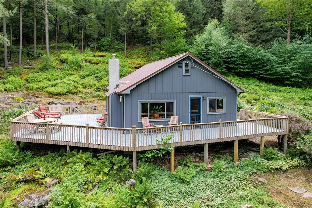 SWEET CATSKILLS CHALET ON 6+ ACRES — ENCHANTED SETTING, ENDLESS CHARM Tucked on a private mountainside, this 2BR/1BA retreat offers simplicity, warmth, and natural beauty. Over 6 acres of stone outcroppings, native plantings, and woodland paths create a storybook setting. The chalet features a newly painted exterior, metal roof, and a substantial wood-burning fireplace at its heart. A wraparound deck embraces the outdoors, ideal for morning coffee or starlit evenings. The property also offers a practical tool shed along with a recently added workshop, complete with a durable metal roof and ready for your finishing touches. Just 5 miles from Margaretville and minutes to Belleayre and Plattekill, this cozy cabin is perfect as a weekend retreat, full-time home, or income property.