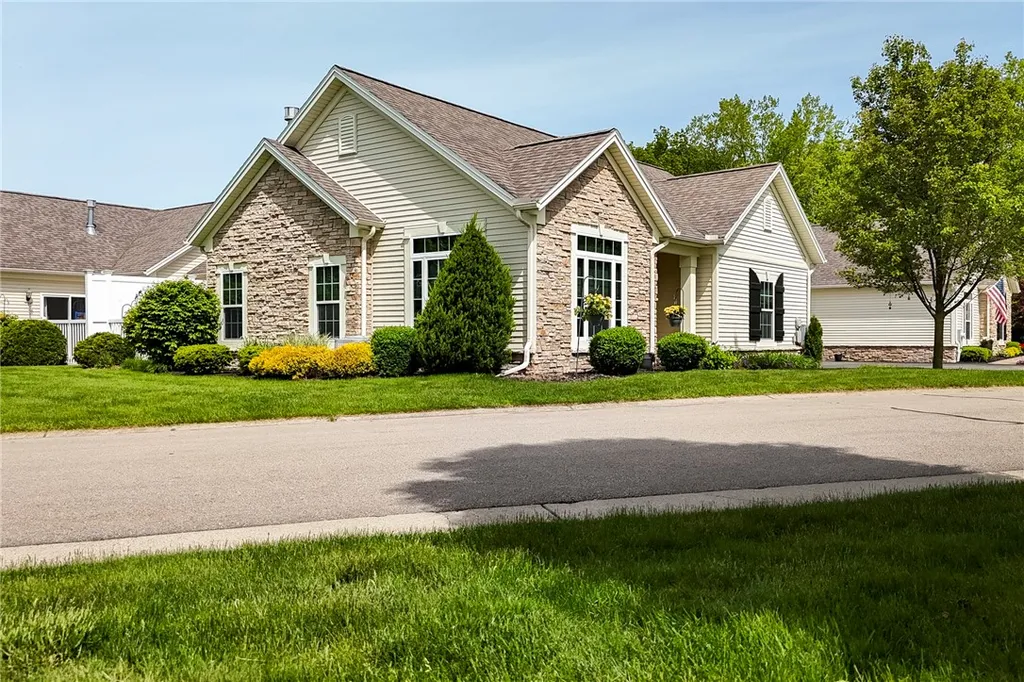 FABULOUS MAINTENANCE FREE LIVING, minutes from the charming village of Webster! This popular, sought after community offers RESORT STYLE LIVING-including a clubhouse, fitness center, refreshing in ground pool, social activities, and it is all maintained by the HOA. All exterior maintenance including roof, siding, driveway, landscaping and snow removal is professionally managed. This 2 bedroom, 2 bath home is in OUTSTANDING CONDITION, very lightly lived in and feels like NEW! Superb details throughout include sleek Acacia hardwood flooring, soaring ceilings, recessed lighting, large closets and oversized tinted windows. A smart floor plan features a sizable primary suite with walk-in closet, en-suite full bath with double vanity, PLUS sliding glass doors to the patio, AND a generous guest bedroom on the other side of the home providing lots of privacy for everyone. A convenient and stylish second full bath services guests. Wait until you see the living space! The wide open and elegant great room has a lovely stone gas fireplace and a second set of sliding glass doors to a splendid SECLUDED PATIO with privacy fencing. The kitchen is well appointed with a thoughtful design and high end finishes, featuring ample wood cabinets, GRANITE counters and island, full pantry, s/s appliances and a roomy eating area. Finally, a cozy den/study is perfect for a home office, sitting room or additional guest space, boasting large windows, a ceiling fan and French doors. Additional features: on demand tankless water heater, CENTRAL AIR, first floor laundry room, and 2.5 car attached garage with a dedicated, secure storage room! First showing, Friday 6/27. Open house Sunday 12-3. Delayed negotiation form on file. Please submit all offers by 8 pm on Tuesday, July 1st and allow 24 hours for response.