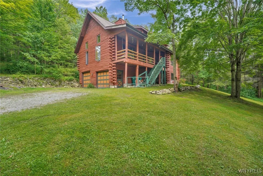 Rustic Elegance on 5+ Private Acres – Log Home Retreat in Wyoming County! Escape to the country and discover this stunning 3-bedroom, 2-bath log home nestled on 5+ wooded acres in the heart of Wyoming County. Surrounded by mature trees and natural beauty, this property offers the perfect blend of privacy, serenity, and rustic charm. Step inside to soaring cathedral ceilings and the warm glow of natural wood finishes throughout. The heart of the home is a breathtaking great room featuring a gorgeous floor-to-ceiling stone fireplace, ideal for cozy nights and entertaining guests. The open-concept layout flows effortlessly into a spacious kitchen and dining area, creating a welcoming space for family and friends. The home offers three generously sized bedrooms, including a peaceful primary suite, and two full baths thoughtfully designed for comfort and convenience. Large windows bring in natural light and offer stunning views of the surrounding forest. Step outside onto the covered deck and breathe in the fresh air—this is where the beauty of the property truly shines. Towering trees provide shade and seclusion, creating your own private sanctuary for enjoying coffee at sunrise, watching deer wander through the yard, or stargazing under Wyoming County’s clear night skies. Whether you're looking for a weekend getaway or a full-time residence, this private retreat has it all — peace, privacy, and timeless log home charm. Don’t miss this rare opportunity to own your own slice of the Wyoming County countryside. With 5 acres to explore, there’s plenty of room for gardens, trails, outdoor recreation, or even a future outbuilding or guest cabin. The property is easily accessible yet feels worlds away from the hustle and bustle. This home features a Culligan Water Treatment System installed in 2023. Enjoy peace of mind with a new tear-off roof with a transferable warranty that will be installed in the next 2-3 weeks.