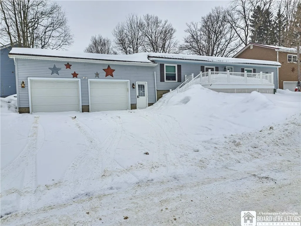 Updated and being sold fully furnished! This 3 bed, 2 bath, one level home is 100% move-in ready. Open living space with a great flow from the living room, to the dining room, to the kitchen. A formal dining room, breakfast bar, and additional eat-in kitchen space offer lots of dining options and space for guests. Through the sliding door in the dining room, there is a wonderful 3 seasons room with outdoor seating and a *new* hot tub - a great space to entertain & hang out with family and friends OR to relax and have some peace and quiet! The primary suite has a beautifully updated bathroom with a walk-in shower, soaking sub, and double sinks. The other two bedrooms are positioned near the other full bathroom, providing the perfect layout. One bedroom has a queen bed and the other has 2 sets of bunk beds. First floor laundry room conveniently located right off of the kitchen. The large garage (26'x30') is insulated and has a gas wall unit for heat. There is plenty of space to park two vehicles AND store all of your toys, lawn equipment, tools, etc. Through the garage, there is access to the full basement, which is currently set up as a game room and also has a cedar closet. All appliances are included - the washer, dryer, and microwave are all new! Brand new septic system just installed in the Summer of 2024. This home is located just steps from beautiful Findley Lake and is just a short walk to downtown Findley Lake. Just 10 minutes from Peek 'n Peak Resort. Also close to the snowmobile trails and hiking & biking trails - the perfect location for a great time year round!
