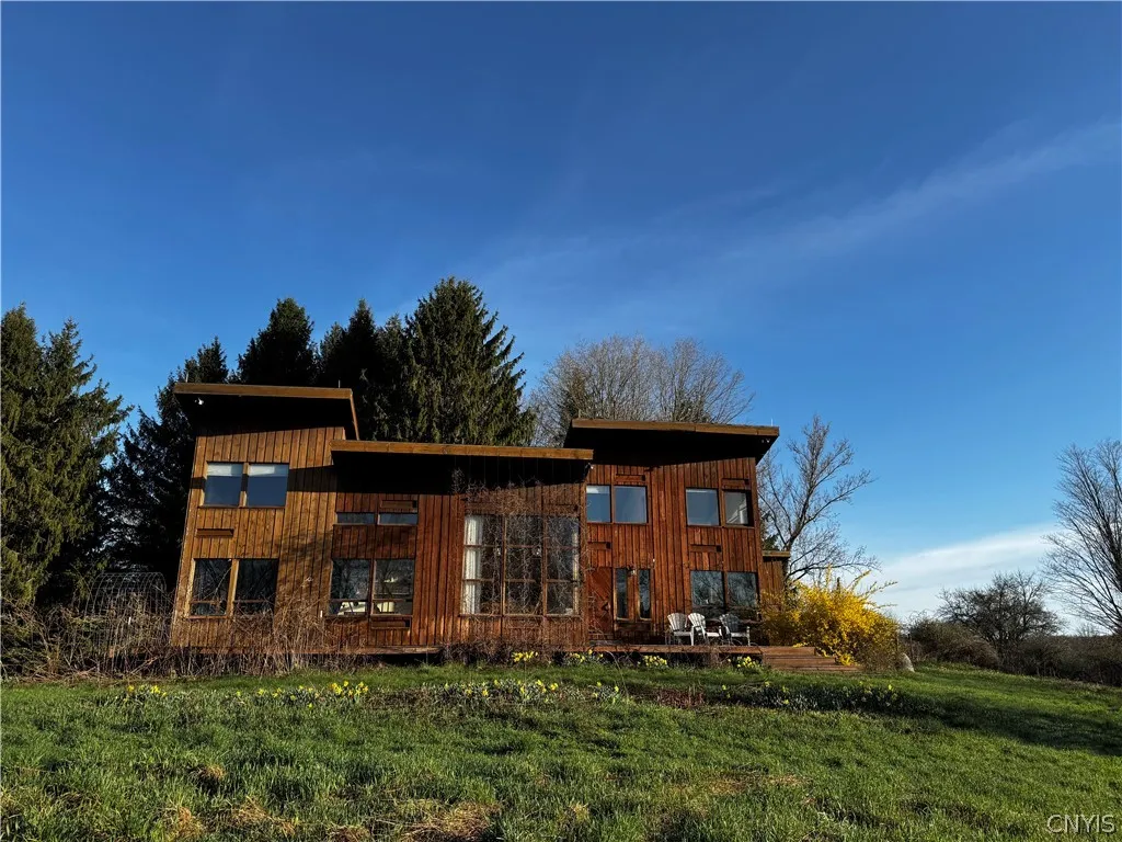 Experience year-round comfort, energy efficiency, and panoramic views of the Hamilton hillside in this uniquely designed Passive Solar contemporary home. Expansive south-facing windows flood the interior with natural light, capturing warmth during the cooler months, while carefully designed roof overhangs provide shade from the high summer sun. The tiled floors help regulate temperature, retaining heat in winter and keeping cool in summer, while strategically placed vents draw in cool air and exhaust warmer air during the warmer months. The open floor plan with a central kitchen and dining area creates the heart of this home and a natural gathering place. A bright living room sits on one side, with a cozy family room on the other, complete with a pellet stove. The first floor also offers two full baths and laundry. Upstairs, you will find three bedrooms, each with their own beautiful view. A mudroom connects to the attached two-car garage, adding everyday practicality. Step outside onto the expansive south-facing deck and take in the peaceful views of the garden and eight private acres. Set back from the main road, this property offers both privacy and tranquility, all while being just minutes from Colgate University and the charming Village of Hamilton.