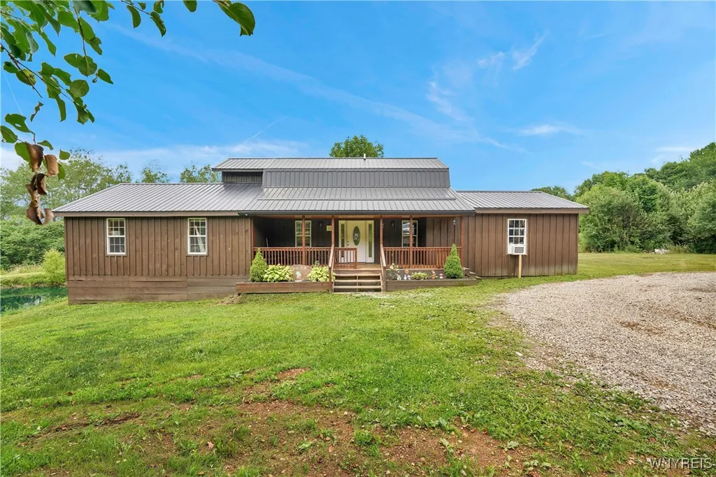 Welcome to 2890 Eagles Nest Road—a charming gambrel-style home set on just under 5 acres along a quiet private road in Yorkshire. Offering privacy, space, and character, this property includes a scenic pond, a detached pole barn, and a layout that works just as well for everyday living as it does for relaxing and entertaining. The home’s exterior features a dark wood-look finish, black steel roof, and a covered front porch where you can sit and enjoy the peaceful surroundings. Step through the front door into a beautiful open-concept kitchen and dining area that flows seamlessly into a massive 400+ square foot living room. Exposed beams in the living room give it a timber frame feel, and hand-burnt natural wood trim throughout adds warmth and personality. A wood stove provides a cozy supplemental heat source during the colder months. The first-floor primary suite includes a full bathroom and plenty of natural light. Upstairs, you'll find a large bedroom and an additional space overlooking the property—ideal for a home office, sitting area, or creative space—along with a second full bathroom. Outside, the 20x32 detached pole barn with concrete floors is perfect for a workshop, garage, or extra storage. There’s also a separate structure with a porch and hot tub that looks out over the pond, complete with electric service. A brand-new septic system has just been installed. If you're looking for a home with a private setting, thoughtful details, and room to make it your own—this one is worth a look. Square footage is based off of updated measurements at time of listing.