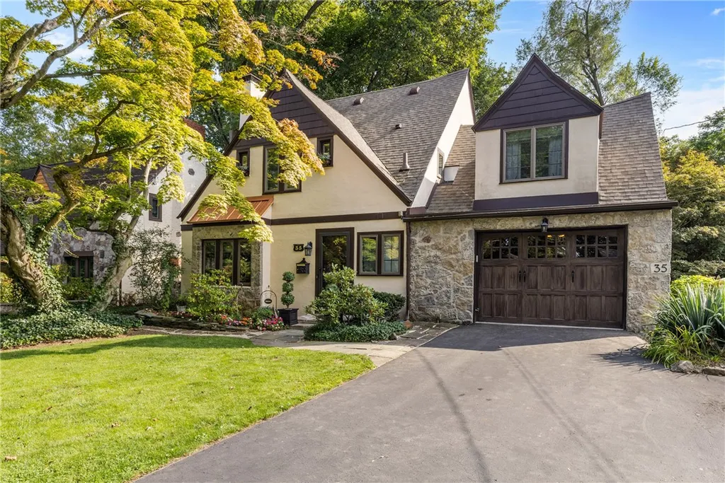 Welcome to this enchanting four-bedroom storybook Tudor, nestled in the heart of sought-after Forest Hills. Bursting with character inside and out, this timeless home features refinished hardwood floors, stunning trim work, and elegant beamed ceilings—creating a warm and inviting atmosphere throughout. The spacious first floor is perfect for both everyday living and entertaining, offering a large living room with a cozy gas fireplace, an adjoining formal dining room, and a beautifully updated kitchen with quartz countertops (2023), new stainless steel appliances (2023), and ample cabinetry. A full bath, laundry room, and mudroom add convenience and functionality. Relax year-round in the heated, south-facing three-season sunroom that overlooks the serene, private backyard. Mature trees, lush perennial gardens, and multiple outdoor seating areas—including a tranquil koi pond and a cozy firepit—create a true outdoor retreat. Upstairs, you'll find three generously sized bedrooms with large closets, plus a spacious owner’s suite featuring dual closets and direct access to a full bathroom. Updates include a NEW tear-off roof (2024), Interior and exterior painting (2023), Kitchen quartz counters, refinished cabinets and all new appliances (2023) and extensive updates to landscape and gardens (2023-2025). This one-of-a-kind home blends classic charm with modern updates in a picturesque setting—don’t miss your chance to own a piece of Forest Hills history. Delayed showings/negotiations on file. Showings begin Thurs. 9/25, offers due Tues. 9/30.