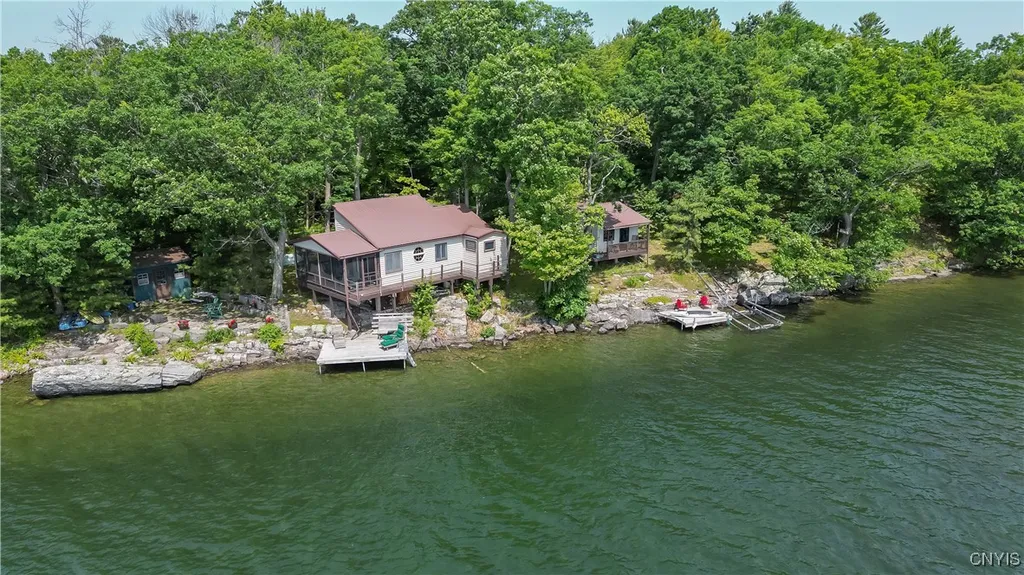 ST. LAWRENCE RIVERFRONT COTTAGE + GUEST CABIN WITH 500+ FEET OF FRONTAGE! Welcome to 35 Schnurr Road—a rare and remarkable opportunity to own an absolutely adorable, quaint, and cozy riverfront retreat on the magnificent St. Lawrence River. With an unheard of 550 feet of pristine waterfront, this one-of-a-kind property offers the perfect blend of charm, privacy, and unforgettable views. The 677 sq. ft. main cottage is open-concept and welcoming, featuring a spacious living room/dining area that flows into the kitchen, complete with a pantry and full bathroom. Up in the loft, you’ll find room for three beds—ideal for extra guests. But it’s the large, screened-in porch where you’ll spend most of your time—your front-row seat to peaceful mornings, river sunrises, and breathtaking river views. A short distance away is a charming guest cabin—your visitors will love having their own private space complete with a bedroom, half-bath, and their own covered porch with that same stunning St. Lawrence River backdrop. Outside, there’s room to roam and relax with natural rock outcroppings, two docks for all your boating and water adventures, flagstone patio, and perfect spots to fish, swim, or jump right into the river. There's also two spacious storage sheds, perfect for keeping your gardening tools, water toys, outdoor cushions, and seasonal gear organized and out of the way. There's even a carport to keep your vehicle protected from the elements. The setting in incredibly private, surrounded by mature trees and a forested backdrop that offers both shade and seclusion. Properties like this don’t come along often—especially with this much waterfront on the St. Lawrence River! Whether you’re looking for a seasonal getaway or a place to build lifelong memories, this riverfront gem is ready to welcome you. Schedule your private showing today. *OFFERS DUE BY MONDAY JUNE 30th at 5pm*