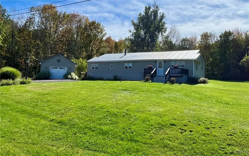You will enjoy EASY FIRST FLOOR LIVING in this Ranch Style Home on 3 Peaceful Acres! It is Amazingly tastefully updated and in MOVE IN Condition! This Country Home will meet all your needs- From a fantastic backyard with deck for entertaining; to the Open front Porch- you can take in views all around and enjoy! The 1 car Plus Garage has electricity & extra workshop space. Inside this fabulous home you will find an updated Kitchen with quaint breakfast bar and built in desk alcove for home workspace! The Living Room and Primary Bedroom have cathedral ceilings which give the rooms a Spacious feel. You will take pleasure in the warmth of the pellet stove when you gather round it this winter. All three bedrooms are amply sized and there is a First floor Laundry Room with a sink for your added convenience. The Large BONUS ROOM Addition will surprise you with so many options for its use! It would make a great space for a large Family Room, it could also be an additional BR or Primary Bedroom Suite (as there is already water available there for second bathroom), or even Home Office if you happen to run a business out of your home! It had previously been used as a Hair Salon. Many Updates have been completed in this home including: Roof, Kitchen, Bath, Floorings, Appliances, Electrical, and Septic System! Although it started as a manufactured home you would never know it- and you must see inside to appreciate! Public Water, Paved driveway with Stoned area for Xtra parking and wooded area to the side of the home complete this fabulous find! Don't wait, see it today!