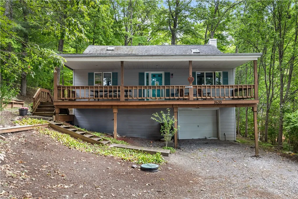 Keuka Lake-the Adirondacks in the Finger Lakes setting with a wonderful cape-look, but with a rustic flare on the interior with vaulted ceilings, wood burning fireplace, great room, and master suite in the upper loft. Full basement with a one car garage, and lots of space for all kinds of possibilities on the lower level. A wonderful open porch with wonderful lake views to the north. At the lake you'll find a new beach house together with a large permanent dock on 75' of natural lake frontage. This is a really comfortable lake home with so many extras, and fully furnished. Please do not go up the driveway without an appointment as it is owner occupied. Delayed negotiations to begin on Wednesday, August 27th, at 12:00PM