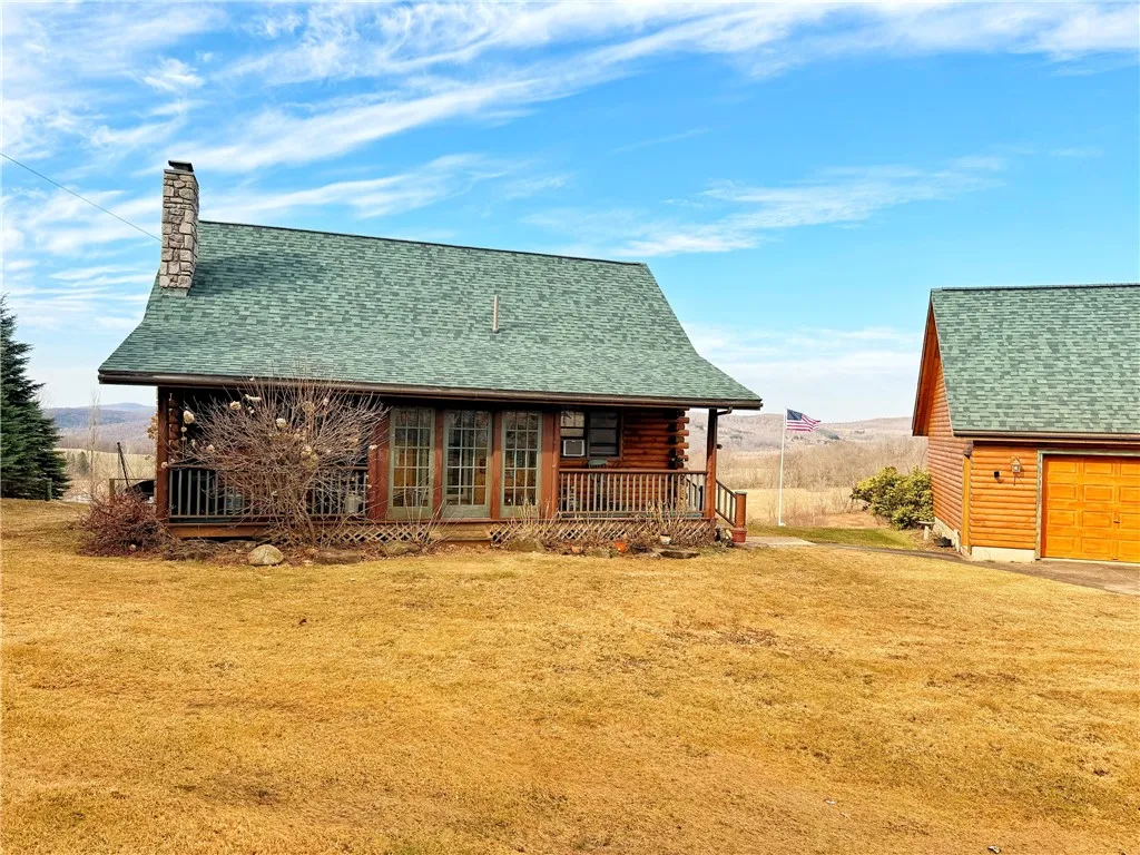 Charming Beaver Mountain Log Home with incredible mountain views!! This stunning 2 bedroom, 1 ½ bath well built log home sits on over 7 surveyed acres on a dead end town maintained road. The inviting enclosed entryway features beautiful slate floors and opens on either side to covered porch areas. The living room with cathedral ceiling has a woodstove tucked in the corner which adds to the rustic charm of the house and provides plenty of warmth. The living room flows into the dining and kitchen areas. Cooking will be a delight in the beautifully renovated eat-in kitchen, complete with granite countertops, a commercial-grade range/oven with a Jenn Air range hood, custom blonde hickory cabinets and hand crafted island with storage and seating. Additional storage can be found in the pull-out pantry. A heated closed in porch off of the dining area allows you to enjoy the gorgeous mountain views during any season. Walk through the door onto a covered porch where you can enjoy the mountain breeze. A bedroom and full bath complete the first floor. Upstairs you will find a second bedroom, convenient half bath, and a sitting area overlooking the living room. Impressive craftsmanship is found throughout the home, with features such as a driftwood handrail, custom closet doors, stained glass details and cornices showcasing Alaskan travertine tile stone artwork. The handcrafted entertainment center, adorned with individually carved oak leaf embellishments and a lighted display case, adds a unique touch to this living space. The full basement provides plenty of storage space. Updates include newer roofs on both the house and the garage, updated appliances, newer hot water heater and and well tank. The detached 2-bay garage, with insulated ceiling and a second level, offers endless possibilities whether for a workshop, studio, or additional storage. The expansive lawn slopes toward a fully stocked spring fed pond, perfect for fishing, swimming, or just relaxing by the water. Just steps from the house are 14 mature blueberry bushes. Minutes to the quaint villages of Stamford and Hobart where you will find shopping, dining, golf, and more.