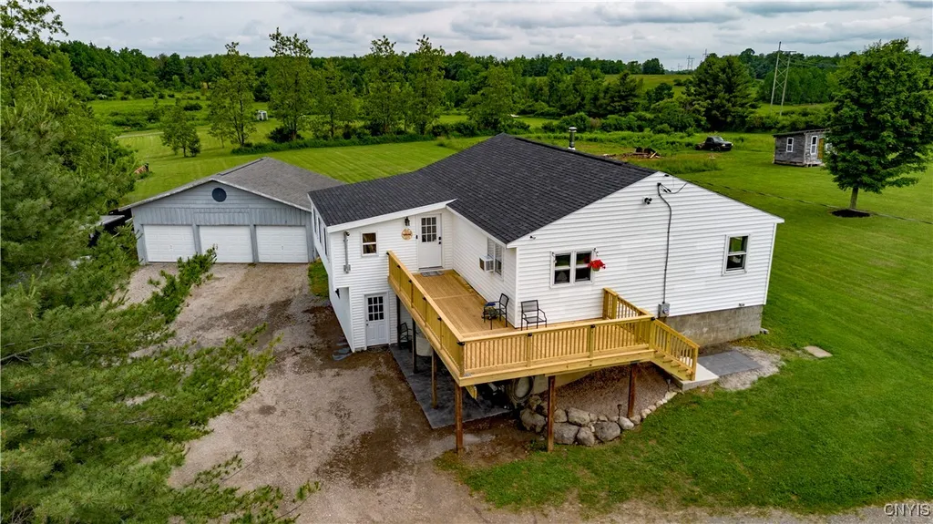 Excited to introduce this country compound minutes from the thruway & outside Canastota, 4045 E Milestrip Rd! Situated on 5 acres of open fields & gorgeous sunsets! This home has been totally overhauled from the ground up! Enjoy coffee or evening drinks on your BRAND-NEW porch overlooking the breathtaking views of the valley! Enter through the French doors underneath the porch into your refinished basement, which per the seller adds an additional 650 SQFT & was created when the basement was finished and has exterior walk-out!! The custom HGTV coat nook makes for organization easy when you're running late! The first level offers endless possibilities as a second living room or even a gym space! An additional bedroom/office space & half bath are a huge BONUS! The living quarters upstairs have an open concept with kitchen & living room making entertaining easy! Hardwood flooring was just installed in 2024 throughout! A Kitchen Remodel in 2024 features NEW cabinets, door pulls, counters, sink, recessed lighting, tile backsplash & SS appliances! The owner's suite has a large walk-in closet & beautiful barn door! The ensuite was entirely remodeled with custom tile shower, faucets, double vanity, tile floor, toilet in 2022! The spare bedrooms offer plenty of space! The second full bath has been updated with tile floors & newer vanity! All the big-ticket items are done for you including roof (2021), furnace (2020) & hotwater(2023)! Let's not forget the detached garage to store all your TOYS! This property & home is an absolute showstopper, it truly has it all!