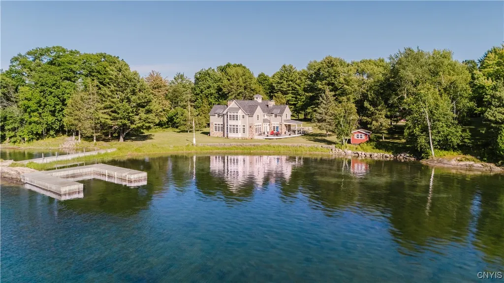 Welcome to Granite Point—an exceptionally well-built, year-round estate on sought-after Grindstone Island. Constructed in 2022 with an uncompromising focus on quality, durability, and long-term performance, this property offers a rare opportunity to own a nearly new, expertly crafted waterfront home at an incredible value in the Thousand Islands. Set on 8.2 private wooded acres with access to the island road network, the offering includes a 4,235 SF main residence, two barns, and 520 feet of prime waterfront with sweeping views of Canadian provincial park islands and award-winning sunsets—just moments from Canoe Point State Park and Grindstone Winery. Built to last in a river environment, the home features Hardie Plank siding, metal/asphalt roofing, energy-efficient windows, and high-performance systems designed for year-round comfort and low maintenance. With 10’ ceilings throughout and exceptional attention to detail, the residence offers both scale and craftsmanship rarely found at this price point. Inside, the home offers 5 bedrooms (3 ensuite, including a first-floor suite) and 5.5 baths with custom cabinetry and tilework. The kitchen is designed for entertaining, featuring dual Sub Zero refrigerator/freezers, two dishwashers, dual sinks, soapstone counters, inset cabinetry, a walk-in pantry, and premium appliances including a Viking propane range, electric wall oven, Miele speed oven, warming drawer, and built-in ice maker. Living spaces include a great room, formal dining room, and den with gas fireplace, along with a dual wood/gas fireplace. Systems include two high-efficiency heat pumps, central air, circulating hot water, whole-house stereo, motorized shades, Starlink internet, and exterior security. The Red Barn (28x60) includes a guest apartment, while the Gray Barn (26x36) offers storage, workshop space, and loft. Outdoor living features an ipe deck, covered porches, and dockage for four boats—perfect for enjoying the award-winning sunsets. Supported by well, septic, and a buried propane tank. A rare blend of new construction, superior build quality, and prime Grindstone Island location—Granite Point is a true legacy property