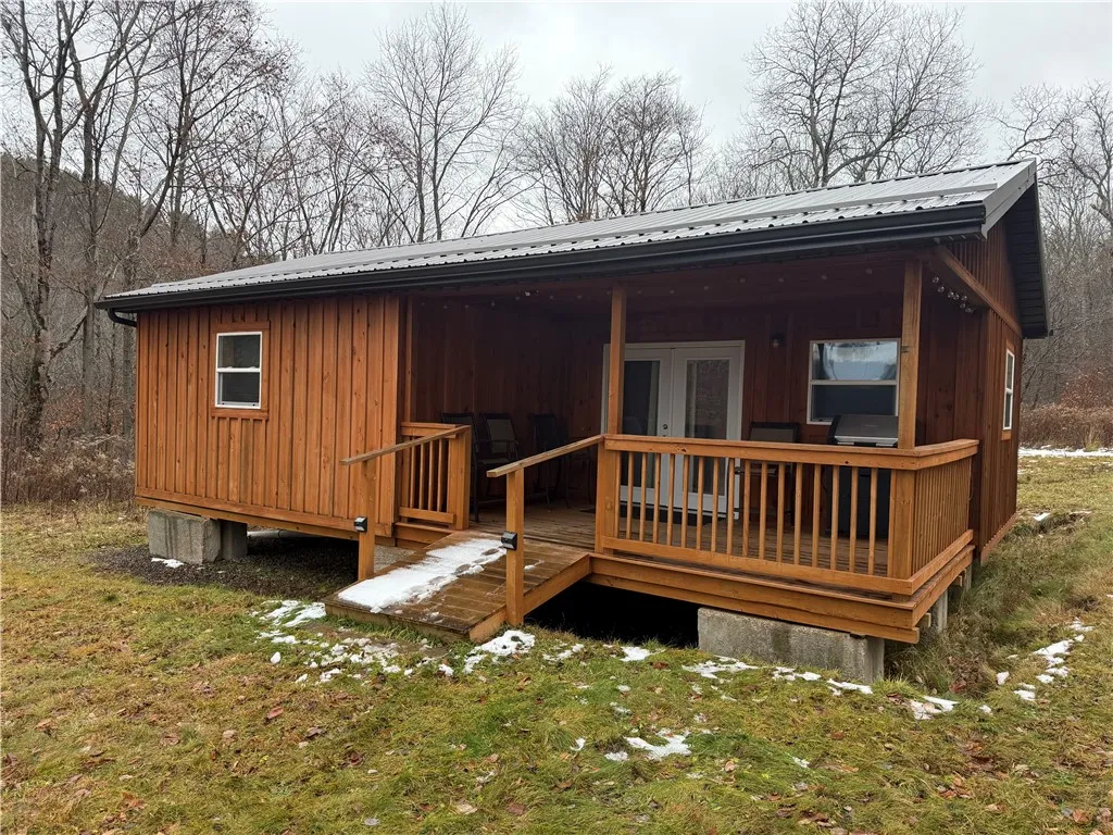 Just two years young and set in the heart of the countryside near the village of Hinsdale, this 2 bedroom, 1 bath cabin on 4.75+/- acres offers a rare blend of comfort, simplicity and potential. You’ll arrive via a dead end road that’s plowed and maintained year round, giving you peace and privacy without sacrifice. Step onto the welcoming front porch where sweeping valley views open up before you—an ideal place for morning coffee, quiet reflection or watching the sunset. Inside, discover a unified kitchen and living room space: open, comfortable and ready for your lifestyle—whether seasonal retreat or full time residence. The cabin features a durable metal roof and is fully insulated; electric power, septic system and an underground tank supplying water are already in place. A modern tankless hot water system adds convenience. Although a traditional heat source isn’t installed, the structure is fully insulated and set up for ease of addition: a wood burning stove, mini split or other heating system would integrate smoothly. Most of the 4.75+/- acres are wooded, offering natural screening, wildlife opportunities and a genuine sense of seclusion. Behind the cabin you’ll find a small storage shed for gear, tools or outdoor equipment. The cabin comes fully furnished, including a fridge and stove—move in ready and primed for your next chapter. Whether you’re seeking a recreational getaway or a year round home immersed in nature, this property delivers. With the turn key furnishings and the modern build already done, the only missing piece is you. Schedule your private tour and step into your next chapter of country living. Additional Info: All gas, mineral, oil and timber rights convey. Do not walk the property without permission. A New York State Licensed Real Estate Salesperson/Agent must be present with potential buyers at all showings. Disclaimer: Map illustrations are provided by Land ID and are for reference purposes only and not the representations of the listing agent or brokerage. Parties should be advised to confirm illustrations with licensed professional service providers.