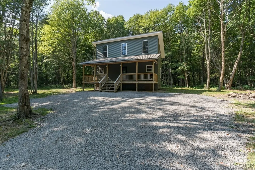 Situated on 71 acres that has hardwoods, including approx. 1000 maples, this new construction home was built in 2023. Tucked off the road for complete privacy, you will walk up to a sizeable front porch that is the perfect place for relaxation and enjoying nature. Inside is compact, but very functional, with a custom ash kitchen, vaulted ceilings, and a space for a dining table and or sitting space. A bedroom and a full bathroom complete the first level. As you go upstairs with a loft concept, turn to the left or right and both spaces allow for several beds to sleep several people, or use one space as a sitting area. It was built so walls could divide both sides if desired. This home was built with spray foam insulation which makes it very affordable to heat. The septic system was put in to accommodate a 4 bedroom home should anyone want to expand the blueprint. The woods that surround the home have not been logged off in may years, so there are mature trees. The trail system is not far away, so this property is ideal for outdoor enthusiast or the person who wants county living surrounded by nature. 2 years old, and 71 acres is a rare find, so don't hesitate to inquire.