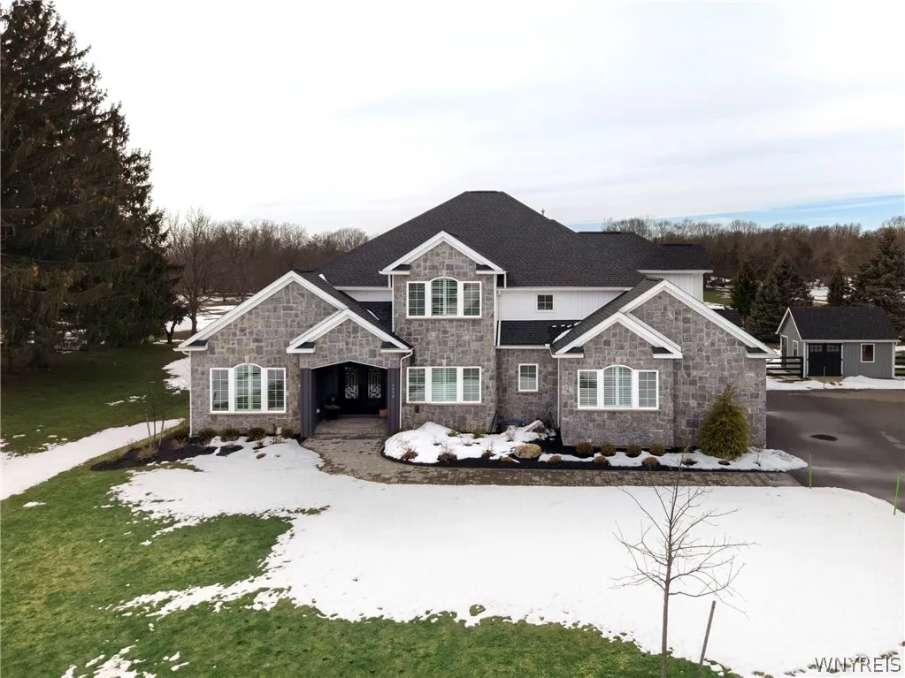 Owner will consider all offers between $1,125,000-$1,225,000 on this exceptional stone home, set on 1.1 acres of beautifully landscaped, park-like grounds in Clarence. Experience the inviting flow as each space seamlessly unfolds into the next. The impressive 2-story foyer welcomes you w abundant light & graceful design. To the right, French doors open to private den—ideal for home office or study. The elegant living room & formal dining area, are perfect for hosting gatherings or everyday dining. Beyond, the heart of the home awaits, stunning gourmet kitchen featuring granite countertops, lge island w bar seating, gas range/oven, convection oven, microwave, under cabinet lighting & brick backsplash. Just off the kitchen, a charming walk-through pantry feels like a mini extension of the space, complete w matching cabinetry, backsplash & extra counter area. The large eat-in kitchen overlooks the backyard, where sliding doors open to an expansive stamped concrete patio. Throughout the 1st floor, rich hardwood floors add warmth & continuity, leading naturally into the adjoining great room. This inviting gathering space features gas fireplace w a beautifully redesigned hearth & mantle, complemented by floating shelves & built-in wine fridge for modern style & convenience. The 1st floor ensuite offers a relaxing retreat, complete w 2-walk-in closets, direct backyard access, & completely renovated, spa-inspired bath featuring a widened entry w barn door, double vanity, new flooring, & custom walk-in shower. Upstairs, you’ll find 3 spacious bedrooms w hardwood floors, including a luxurious guest suite w private balcony, walk-in closet, & full bath. A flexible bonus space w skylights offers endless possibilities—perfect for addtl lounge area, workout rm, or creative studio. Another beautifully updated full bath w custom walk-in shower completes the 2nd level. Outdoor living shines in the expansive, fenced backyard surrounded by lush landscaping & large patio with custom pavers. The heated & cooled 3-bay garage offers year-round comfort & storage, complemented by a 200 sq ft drive thru shed for tools & recreational gear. Thoughtfully designed & meticulously customized!