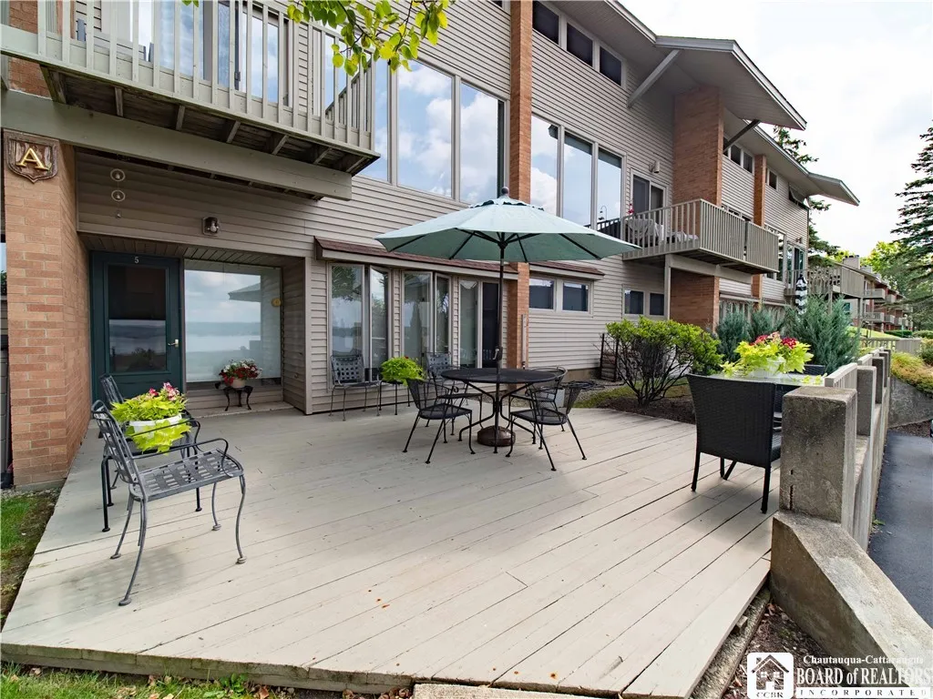 First floor living at the highly sought after Chautauqua Lake Estates. This large 2 bedroom 2 bath unit is being sold fully furnished. Updated kitchen with granite counters, soft close cabinets, SS range/microwave. large living room with fireplace, formal dining room, and first floor laundry. A common bathroom off the living room. Primary suite has its own bathroom. One of the largest decks in the complex makes this unit great for entertaining and relaxing. Great un-obstructed Lakeviews! Chautauqua Lake estates offers a pool, tennis court, playground, Lakefront with dock and more. Internet and cable included in the HOA fee.