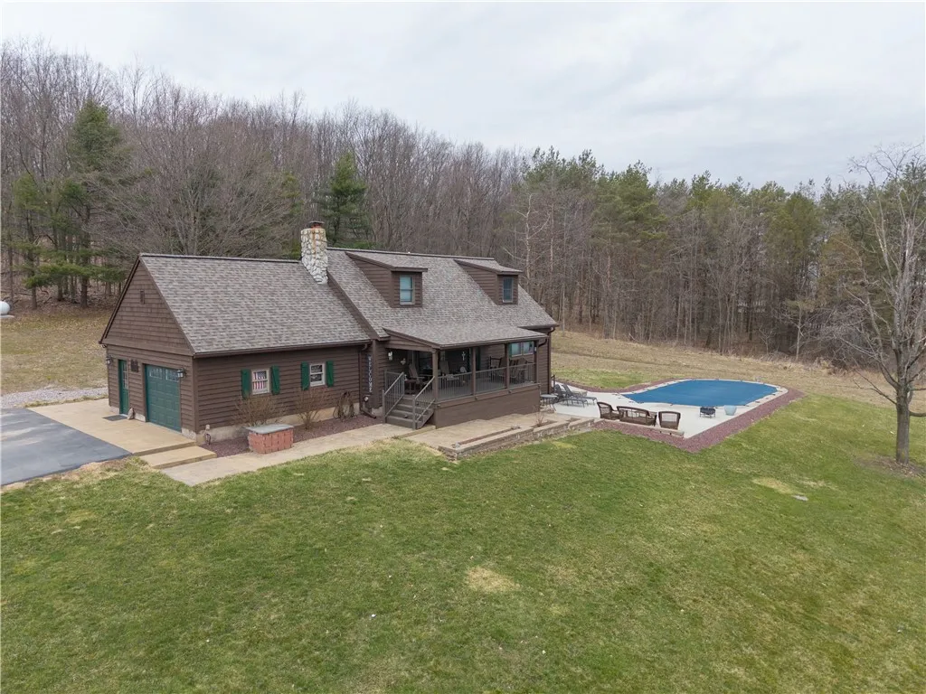 This is your dream! High on your hill sits 12+ acres of privacy with woods, pond, inground pool, and detached 30x20 shop! Sit on your covered porch to enjoy the deer, and sunsets. Stamped walkways and new landscaping leading to your 16 x 32 pool, with a 3 year old liner. A newly finished addition contains soaring cathedral ceilings and floor to ceiling gas fireplace, Hickory cabinets with black quartz countertops, hardwood floors and a walk in pantry. You will find a living room, laundry area, new bath, new primary bedroom with giant master bath and walk-in closet finishing off the first floor. Two beds and another full bath upstairs. The basement is partially finished with a walkout to the patio and pool area. Deer and wildlife at your door! Addition completed in 2024 adding 880 square feet making total sq./ft. over 2000 sq. /ft. Delayed negotiations, all offers are due Monday 4/14 at 1 pm. 24 hours notice to show, animals on premises. Open houses Saturday 4/5 and Saturday 4/12 from 12-2.