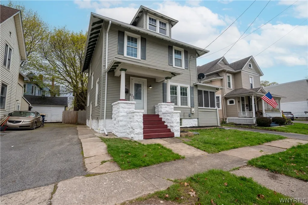 This beautifully detailed single-family home showcases exceptional period architecture paired with thoughtful modern updates. The spacious, traditional floor plan features a large living room highlighted by a stunning staircase and fully functioning pocket doors, adding both charm and versatility. The updated kitchen, along with refreshed lighting, flooring, and a convenient first-floor half bath, brings contemporary comfort to the home's classic character. Upstairs you will find three generously sized bedrooms with newer flooring throughout. The fully renovated upper bethroom is impressively spacious and includes room for a full-size washer and dryer. Outdoor living is just as inviting with three porches-a welcoming front porch, a private back porch, and additional side porch-offering multiple spaces to relax and entertain.