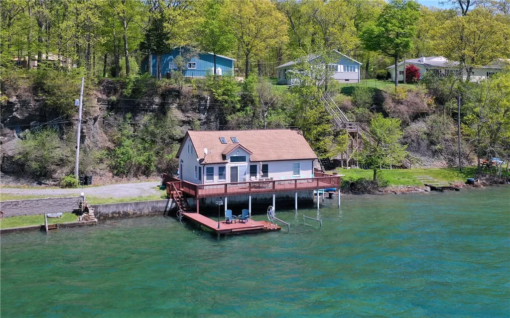 Discover lakeside serenity at 565 Fire Lane 5, King Ferry. Crafted in 1994, this contemporary retreat offers 1,560 sq ft of seamless living, where open-concept design unites kitchen, dining, and living spaces, all framed by breathtaking lake views. Ninety-nine feet of private shoreline invites you to embrace the peaceful rhythm of the water, while a newly constructed wrap-around deck provides the perfect stage for relaxation and gatherings. Featuring two first-floor bedrooms, a full bath, and a versatile loft that can serve as a third bedroom, this home caters to both comfort and flexibility. A full basement with a poured foundation offers abundant storage or expansion potential. Just a convenient 25-minute drive from Ithaca, and with a proven VRBO income of $2,400 per week, this property seamlessly blends tranquil living with lucrative opportunity.