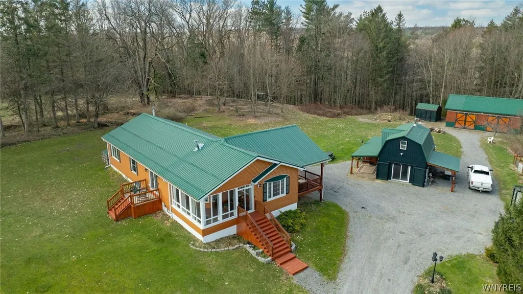 You will find yourself surrounded by nature on this gorgeously serene, wooded, 12+ acre lot. Featuring manicured corrugated pathways winding throughout the property; lovingly cared for Black Cherry, Maple, Hemlock, Spruce, Birch, and Larch Trees; a spring fed pond with its own bankside cabin/shed, ground level hunting blind, and the beautiful waters of Cattaraugus Creek running through the tail end. This property will take your breath away. Storage sheds, a large barn with chicken coop, many garden beds, and a fully functioning guest unit, add even more amenities to this spectacular property. As you enter the well maintained 3-bedroom, 2-bath Ranch home, you will be greeted by the first floor laundry, a large and inviting country kitchen, spectacular cherry wood molding and hardwood floors, brand new Andersen windows and doors throughout, and so much more! A full house generator, and central A/C will ensure your comfort, no matter the conditions outside. Partially finished basement boasts 9ft ceilings, a wine cellar, workshop, family room, and cedar closets- providing excellent storage opportunities! This home is move in Ready, and a must see!