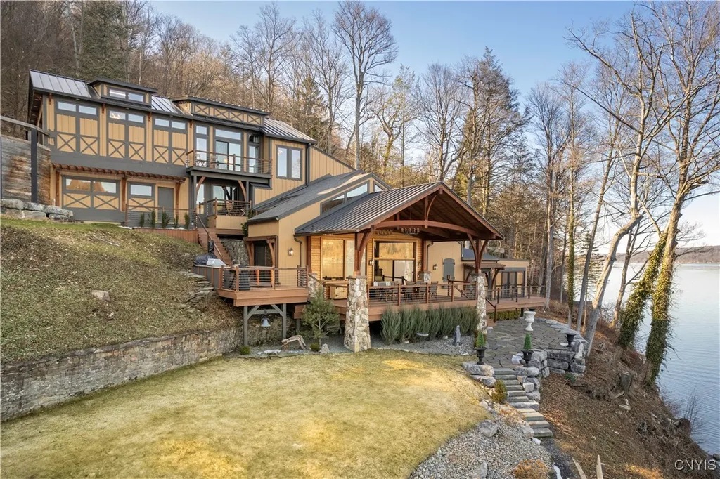 Camp Haven is a 4175 Sq. Ft. Timber frame Adirondack-style home with five BD./4.1 Baths offering complete serenity. Upon entering, see the 180-degree views of the lake and Staghorn Cliffs. The house has been completely renovated with additional Timber frame structure and details. A Majority of the interior is detailed with wood ship lap and extensive stone work throughout. Each bedroom leads to its private balcony. The kitchen allows for large gatherings and meal prepartion. The open pantry off the kitchen allows additional storage space with a custom built-in coffee maker, wine fridge, & bar, and an extra refrigerator. The outdoor kitchen has a wood pizza oven, a Kitchen Aid grill, and a Traeger Smoker. The exterior has several decks, sitting areas, and a wonderful gathering place with a fire pit. No expense was spared when updating the bathrooms, kitchen, pantry, laundry, HVAC, plumbing, and electrical systems. Large tool room & workshop for the handyman enthusiast, additional storage room, and secondary laundry room in the lower level. A new pole barn with Timber frame details is equipped with water and power. Extensive landscaping includes large rock retaining walls and a fountain. This property has so much detail that it is hard to describe. Whoever is lucky enough to purchase it will enjoy many memories with family and friends in this unique private setting on the Lake. This property is available immediately!