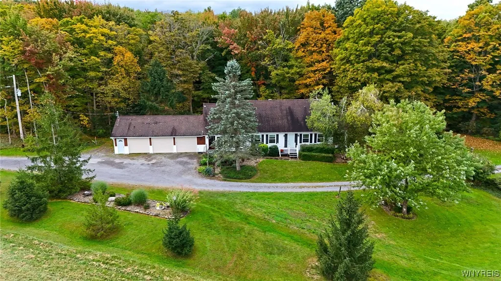 Discover your private retreat on 27.592 acres of scenic woodlands, featuring a stocked pond, hunting stands, and nature trails situated on a dead end street. This 4-bedroom, 2.5-bath home offers 1,968 sq. ft. of well-appointed living space, combining modern comfort with the beauty of the outdoors. Oversized Mudroom – Includes a laundry area and a convenient half bath, Spacious Eat-In Kitchen – Features heated floors, quartz countertops, ceramic backsplash, a bay window, a wood-burning fireplace, and a pantry. Equipped with a gas stove, dishwasher, microwave, refrigerator, and a sliding glass door (installed 3 years ago) leading to a stunning 3-tier deck First-Floor Primary Suite – Boasts hickory flooring and an attached sunroom with floor-to-ceiling glass walls, heated floors, and a remote-controlled gas fireplace overlooking the private yard and pond. Updated First-Floor Bathroom – Includes heated floors and modern finishes Second Floor – Features three generously sized bedrooms, an updated full bath with a walk-in shower, and a walk-in attic for additional storage. All-new double-pane windows from Springville Windows with a transferable warranty, Dry, heated basement with a dedicated workshop space, Attached 3-car garage with a separate heating unit for year-round functionality, Outdoor Features: Free gas & a whole-house automatic Generac generator for energy efficiency, Multiple outbuildings, two with electric, offering versatile workspace options, Private wooded staircase leading to a Creekside trail, fenced area with producing blueberry bushes, greenhouse, and fruit patches, Chicken coop and pasture, perfect for sustainable living, Ideal for outdoor enthusiasts, with trails, hunting stands, and abundant wildlife (deer & turkey). This extraordinary property offers the perfect balance of modern upgrades, privacy, and outdoor adventure. Whether you're seeking a peaceful escape, a sustainable lifestyle, or a recreational paradise, this has it all! Only 12 minutes to Kissing Bridge and 15 to the Village of East Aurora.