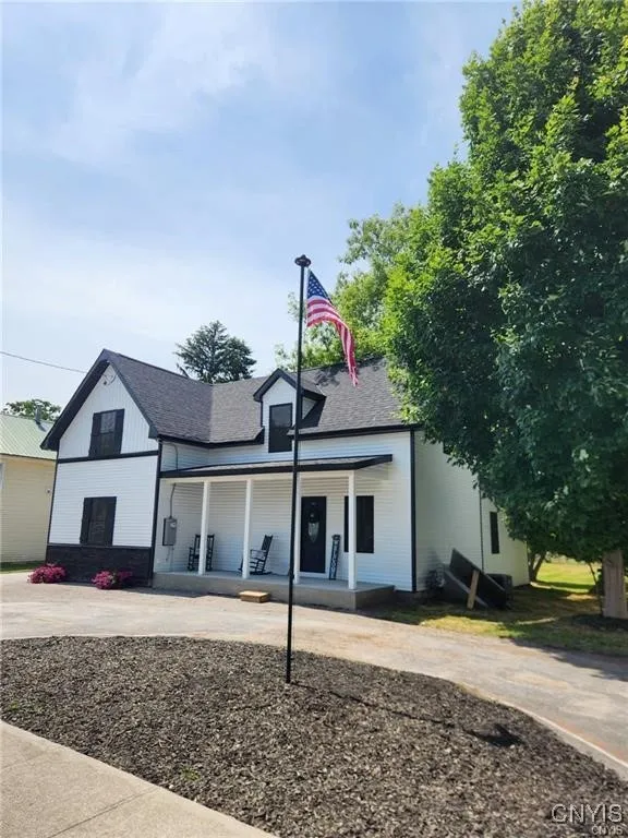 "New construction" without the "new construction" price tag located in the Village of Evans Mills, across from Evans Mills Elementary School. This spacious, 4-bedroom 2 full bath home with 1,980 sq. ft. has been completely REMODELED from the studs to the rafters and tastefully completed with all new modern EVERYTHING throughout. Features include: ALL NEW 200 amp electrical, plumbing, drywall, paint, premium plush wall-to-wall carpeting, LVP flooring, new recessed lighting, premium black-framed windows, doors, cabinets, countertops, fixtures, vanities, toilets, showers, black accents throughout, public water & sewer connected, 40 gallon hot water tank, natural gas furnace with central a/c, white vinyl siding with black stone facade, black soffit & fascia with soffit lights, brand new architectural shingled roof, newly built front covered porch and rear porch. On the main floor, you will find a very spacious living-room, as well as a HUGE bedroom with a large walk-in closet. This room could also be used as a den or a playroom. The possibilities are endless. Stunning, light & bright, modern kitchen with all brand-new stainless-steel appliances and a large dining area is perfect for family dinners. Additionally, on the first floor, you will find a large full bathroom with washer/dryer hook-ups. Absolutely ideal for single floor living. No need to climb stairs when everything you need is right on the first floor. The second floor features another HUGE master bedroom with his & her walk-in closets and a full bathroom, along with 2 more good size bedrooms. Outside, a u-shaped driveway has been freshly paved around a brand-new solar flagpole, boasting GORGEOUS curb appeal. A freshly paved driveway leads out back to a newly built 20'x24' detached 2-car garage. This home sits on a HUGE 0.67 acre lot with a DEEP partially fenced surveyed back yard, that's just perfect for entertaining. Jeff. Co. Database has incorrect info., living space has been added by converting exiting garage & garage cap during remodel. Located in the Indian River School District and just 5 minutes to Fort Drum Main Gate. No detail has been missed in this beauty! It's an absolute must see property!