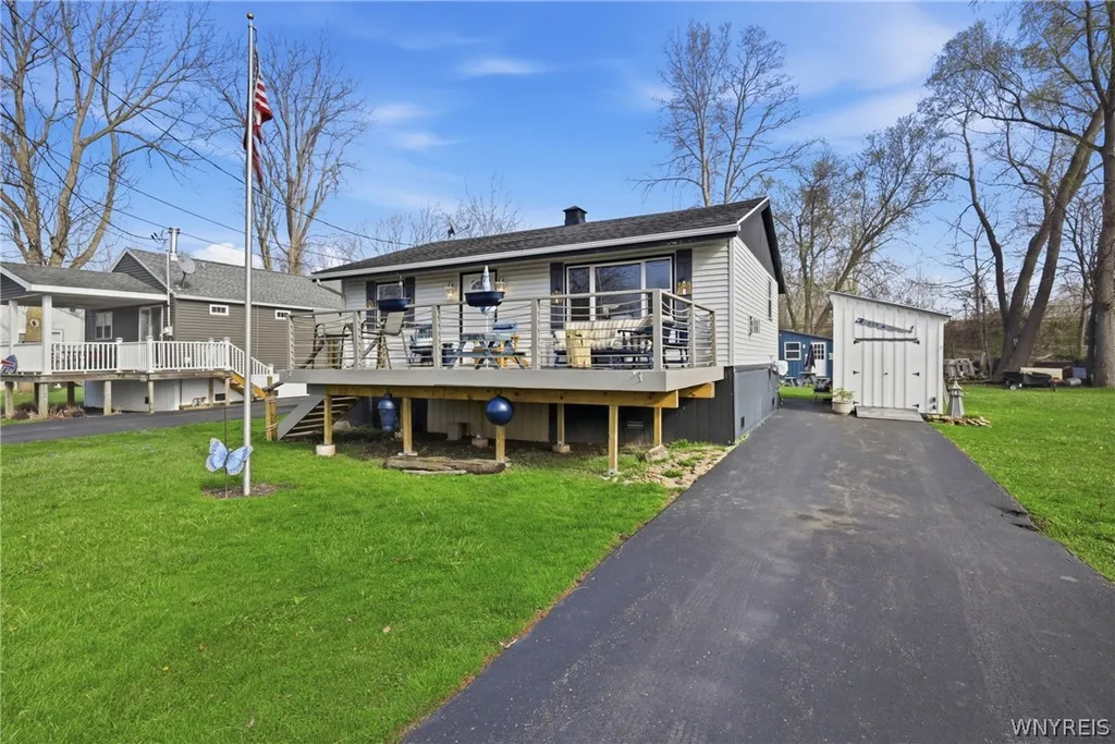 If you LOVE waterfront restaurants and beaches but want to be a step out of the action on some occasions, this house is for you! This bright and airy, newly remodeled property has everything imaginable. The homeowners thought of convenience and practicality when they designed this year-round home! The walls have been taken down to the studs & all new electric & plumbing, as well as vinyl flooring, epoxy countertops, a wet bar w impressive lighted countertop, ice machine, and refrigerator. A matching wine bar, w/lighted fireplace in den area or use it as a dining area. Kitchen has an impressive design with an island breakfast bar combo, a wonderful pot filler, gas convection & air fryer oven, dishwasher, many cupboards, dove tail soft-closing drawers, utensil drawer, spice & pan cupboards, & open decorative cabinets to display your favorites. Open floor plan allows you to view the living space, outdoors, as well as gives you a view of the 2nd fireplace-gas, tv (included) and a view of the new decorated deck or lake. The ample size main bedroom has 3 closets, built in shelves and space saving farmhouse doors. Second bedroom has a huge closet currently used as large pantry. Totally remodeled bath w/laundry facility (included)has the walk-in shower, farmhouse door, glass block window, lighted modern mirror, and blue tooth sound in the exhaust fan and light! Step out to either front or rear deck to have your coffee, favorite beverage or relax in the large hot tub complete with TV and a bar table on the hot tub. For the guests that can't drive home-there are 2 spacious sheds in back with electric and heat, both currently used as offices & extra storage, & teen space when they arrive, oh wait!!! A 3rd shed for tools with electric and half is a garden shed. Tankless hot water in the attic, back up heating with monitor heaters as well as 2 fireplaces, year-round enjoyment here. Very few ever this nice, 10 minute walk to Cabana Sams, Sunset Bay, as well as 10 minutes drive to the Thruway. Home Feels much larger due to the design. You will want to hurry on this one, showings start 4/21/2026 Negotiations start 4/28/2026 AT 3PM.