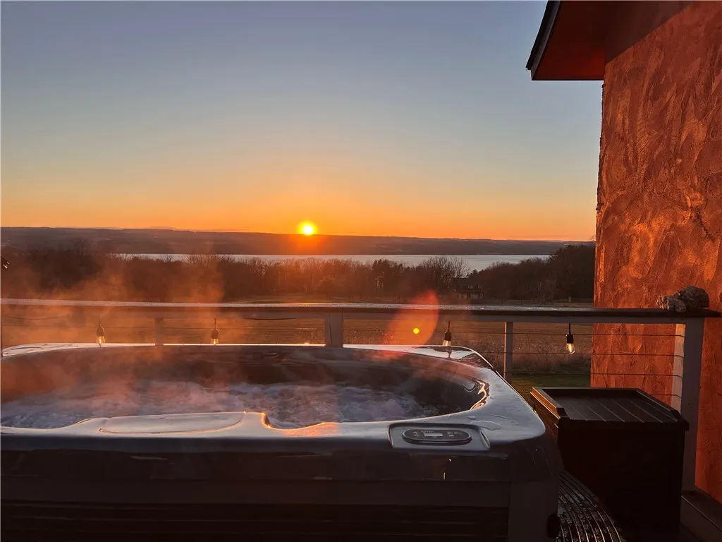 Seneca Lake views and private lake access are yours with this custom two story chalet inspired home. Backed by acres of vineyards overlooking the lake, the home is just down from Rt. 414, in a private subdivision off of Rhodes Rd. The neighborhood is comprised of mostly 2-10 acre wooded parcels, with homes enjoying stunning views and privacy. This chic home, built in 2019 is a custom cottage with all the bells and whistles. Filled with light from the well placed windows, it begins with a main level master and bath/laundry suite, fully equipped kitchen, and living room with propane heating stove on the main floor, all wrapped in warm wood finishes including long-lasting hickory floors. The second level with lake facing dormer windows includes a bedroom, bath, and living room to accommodate guests or family. Plenty of private spaces even with the open floor plan below. The lower level, constructed with Superior insulated concrete walls and exterior Bilco access, offers excellent potential for future finished space while currently serving as a functional studio and storage area. Heat is supplemented by electric baseboards in the basement and master bedroom/bath, but the owner enjoys heating the entire home with the propane stove in the living room. On the deck, the perfect wind-down opportunity - a new 2025 hot tub for two, with room for your wine service! What truly sets this property apart is the included ~25 feet of lake frontage, which is just a short distance away via Andrea Drive, including a brand-new Trex dock. Whether arriving by boat or taking the scenic newly constructed stairs (2025) down, this dedicated access point provides everything you need to fully embrace lake life—without the burden of high waterfront taxes. Shared road maintenance is an easy $250 per year. There is only one property like this - don't hesitate to seize the moment!