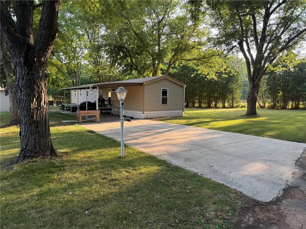 Come see this tastefully redone home in the desirable Heritage Estates Community. This corner lot is adjacent to vacant property and offers a wonderful outdoor setting. The home has had numerous upgrades over the last few years to include... Roof, siding, skirting new in 2023, furnace and central air new in 2024, hot water tank new in 2025, 40ft cement pad, 30ft covered by awning, sliding glass door to deck new in 2024, bathroom updated with walk in shower in 2025. Shed built in 2024, shed has electric and comes with propane wall heater External Portable Generator Hook-Up Current lot rent is a very reasonable $375/month. Purchase would require park approval. Come see this wonderful home today. Sellers will need to find suitable housing. Cameras are present, no audio.