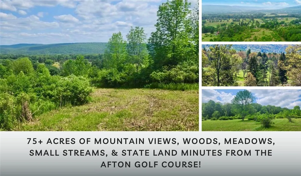 Welcome to 75+/- acres w/ breathtaking mountain views, just 5 minutes from the Afton Golf Course clubhouse! Wake up to expansive vistas of the Catskills to the east, while enjoying a unique proximity to the 17th tee—across the street! For golf enthusiasts, this property offers a chance to live with the experience of being on the course, w/ the added privacy of your own land. This exceptional parcel offers a rare combination of natural beauty & recreational convenience. With its ESE orientation, this land could be ideal for generating solar energy, making it both scenic & sustainable. Key features include: *Located on a town road *Spectacular mountain views *Adjacent to Oak Ridge State Forest with nearly 600 acres for hiking, hunting, fishing, camping *Close to Afton Speedway, Oquaga Creek State Park, & Animal Adventure Park *Convenient to I88, w/ access to Binghamton & Oneonta *About 3+/- hours from NYC Whether you're looking to build your dream home, create a weekend getaway, or enjoy recreational pursuits, this property offers limitless possibilities. Don't miss the chance to own a piece of paradise with mountain views & a golfer’s dream location!
