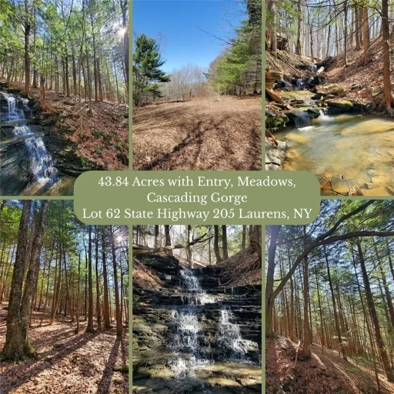 This 43.84 acre land parcel features an established driveway rising up to a few nice meadows with a westerly view, lengthy road frontage (1758 feet with multiple electric poles) on a well-traveled state highway, a nice mix of pine and deciduous tree growth as the land slopes slightly to moderately, and even has a stunning upland stream gorge with cascading waterfalls and riffles. This would be an excellent option for those looking to establish a permanent home site, anyone with an eye towards investment to capitalize on the burgeoning Oneonta-Cooperstown region short term rental market, and could be superb as a recreational parcel for hunting, camping, and exploration. All the basics are already set up here - an nice entry off the road gives a little elevation and buffer from the road, and then has a switchback to a meadow that would make a great home site. The trail then proceeds east to a secondary meadow and then further to the gorge itself. All these features combine for a compelling option for those in the land market, and this one is just under 10 minutes to the heart of Oneonta, and only 3 hours from metro NYC.